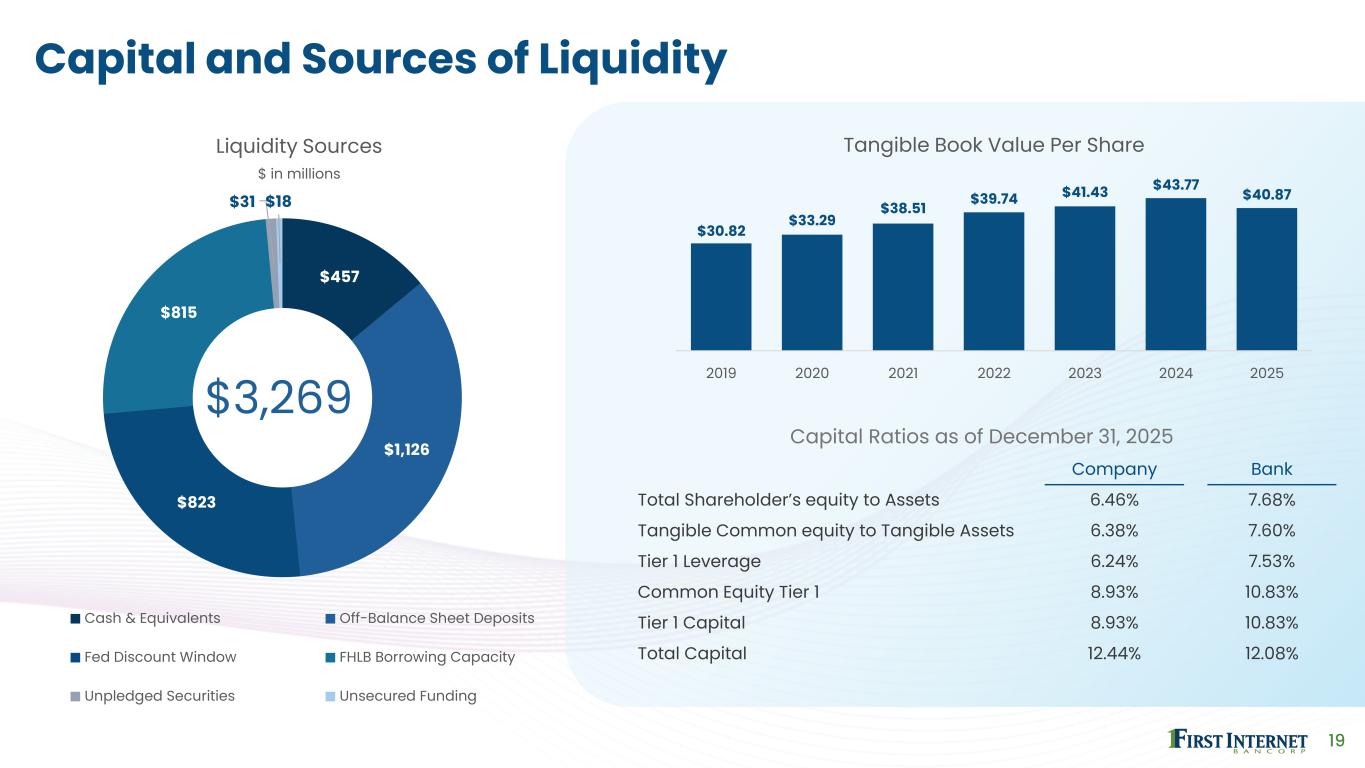 18 Credit Quality Overview $44.8 $47.2 $46.5 $59.9 $55.7 1.07% 1.11% 1.07% 1.65% 1.49% 4Q24 1Q25 2Q25 3Q25 4Q25 Allowance for Credit Losses ACL ACL/Total loans $ in millions $9.4 $9.7 $14.3 $21.0 $16.0 0.91% 0.92% 1.31% 1.89% 1.68% 4Q24 1Q25 2Q25 3Q25 4Q25 Net Charge-offs NCOs NCOs/Average Loans $ in millions $7.2 $11.9 $13.6 $34.8 $12.0 4Q24 1Q25 2Q25 3Q25 4Q25 Provision for Credit Losses $ in millions $24.1 $30.7 $36.2 $44.7 $47.7 $4.8 $5.2 $9.3 $10.5 $13.6 $28.9 $35.9 $45.5 $55.2 $61.3 0.50% 0.61% 0.75% 0.98% 1.10% 0.42% 0.52% 0.60% 0.79% 0.86% 4Q24 1Q25 2Q25 3Q25 4Q25 Nonperforming Assets Govt. Guaranteed NPAs NPAs ex. Govt. Guaranteed NPAs / Total Assets NPAs ex. Govt. Guaranteed / Total Assets $ in millions