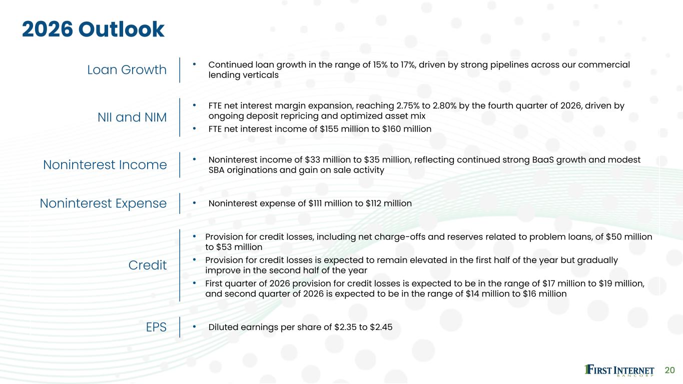 20 2026 Outlook Loan Growth • Continued loan growth in the range of 15% to 17%, driven by strong pipelines across our commercial lending verticals NII and NIM • FTE net interest margin expansion, reaching 2.75% to 2.80% by the fourth quarter of 2026, driven by ongoing deposit repricing and optimized asset mix • FTE net interest income of $155 million to $160 million Noninterest Income • Noninterest income of $33 million to $35 million, reflecting continued strong BaaS growth and modest SBA originations and gain on sale activity Noninterest Expense • Noninterest expense of $111 million to $112 million Credit • Provision for credit losses, including net charge-offs and reserves related to problem loans, of $50 million to $53 million • Provision for credit losses is expected to remain elevated in the first half of the year but gradually improve in the second half of the year • First quarter of 2026 provision for credit losses is expected to be in the range of $17 million to $19 million, and second quarter of 2026 is expected to be in the range of $14 million to $16 million EPS • Diluted earnings per share of $2.35 to $2.45
