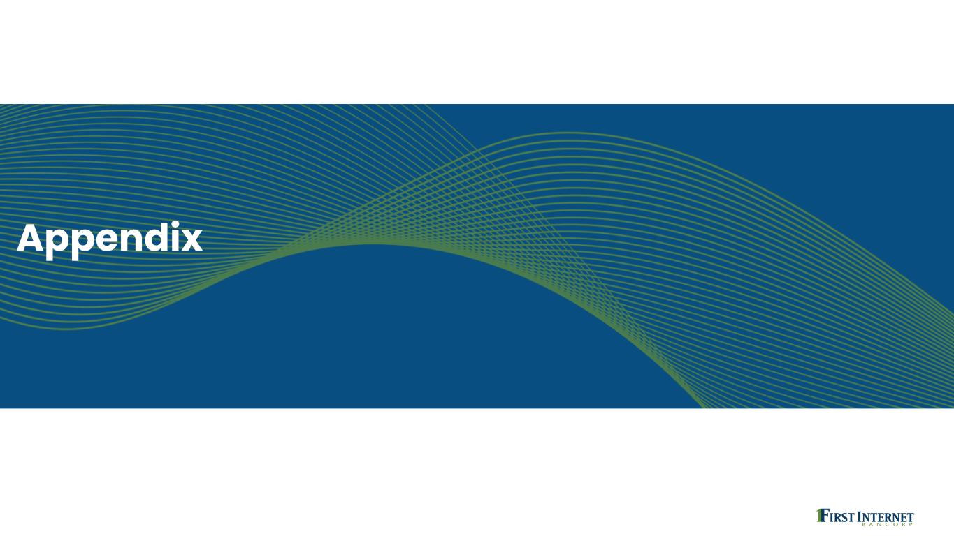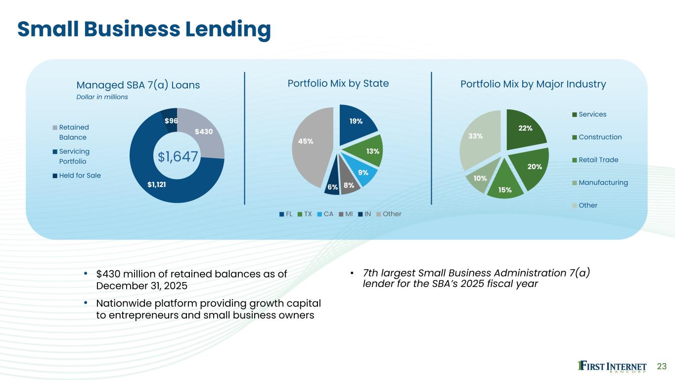 22 Construction and Investor Commercial Real Estate • $1.0 billion of combined balances as of December 31, 2025 • Average current loan balance of $15.1 million for investor CRE • Minimal office exposure; 1.5% of combined balances consisting of suburban and medical office • Unfunded commitments of $439 million • Average commitment size for commercial construction / development of $22 million 63% 34% 3% Portfolio by Loan Type Investor Commercial Real Estate Commercial Construction/ Development Residential Construction/ Development 47% 19% 16% 5% 13% Portfolio Mix by Major Industry Multifamily/Mixed Use Industrial Warehouse Hospitality Senior Living Other 44% 16% 7% 7% 6% 20% Portfolio Mix by State IN AZ CA OH FL Other
