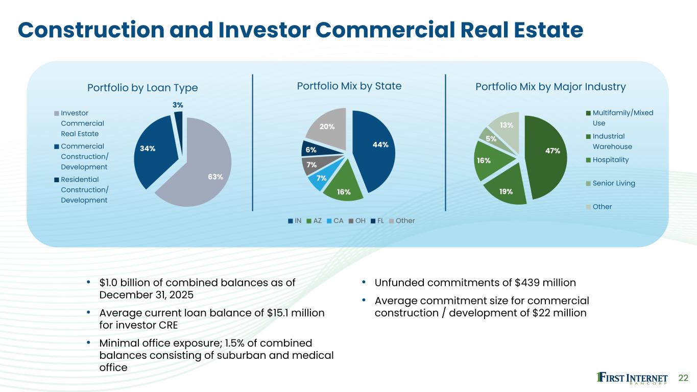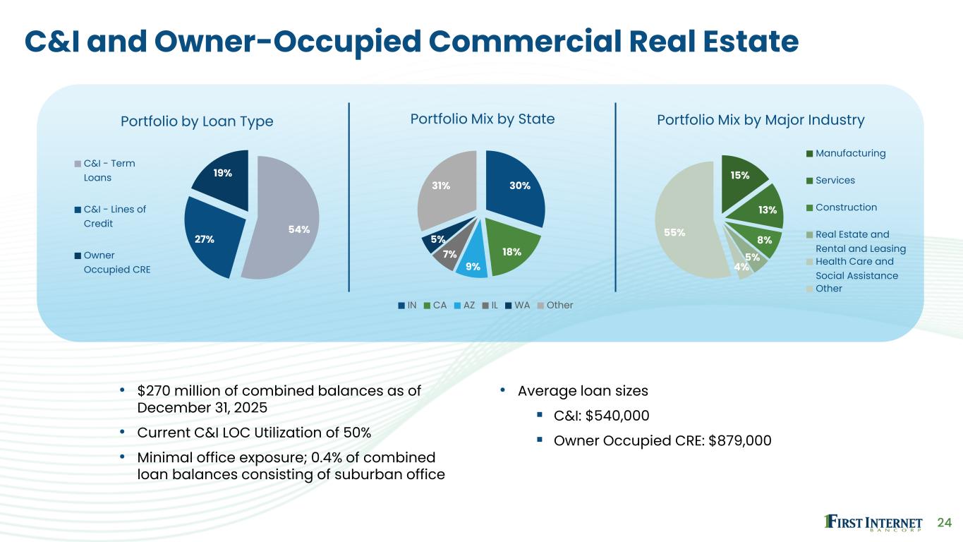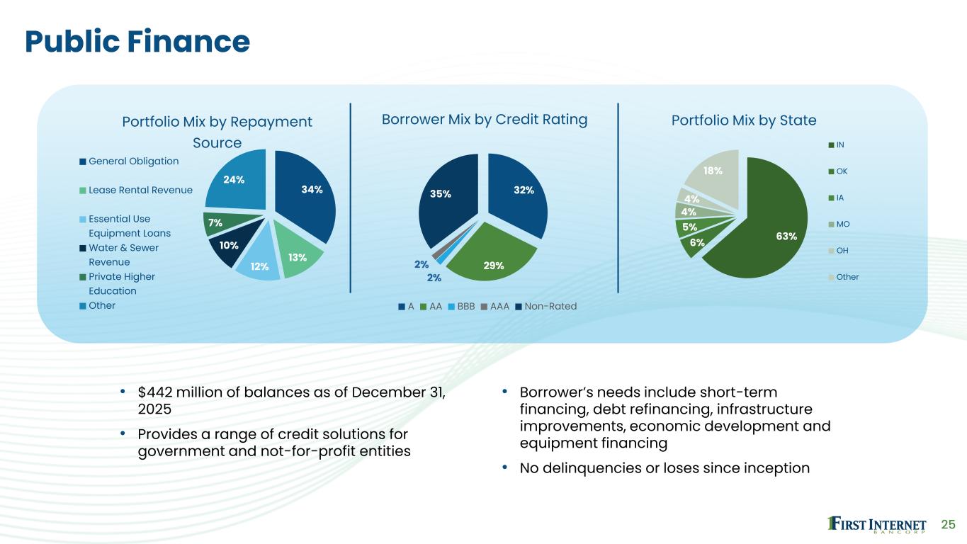 24 C&I and Owner-Occupied Commercial Real Estate • $270 million of combined balances as of December 31, 2025 • Current C&I LOC Utilization of 50% • Minimal office exposure; 0.4% of combined loan balances consisting of suburban office • Average loan sizes ▪ C&I: $540,000 ▪ Owner Occupied CRE: $879,000 54% 27% 19% Portfolio by Loan Type C&I - Term Loans C&I - Lines of Credit Owner Occupied CRE 15% 13% 8% 5% 4% 55% Portfolio Mix by Major Industry Manufacturing Services Construction Real Estate and Rental and Leasing Health Care and Social Assistance Other 30% 18% 9% 7% 5% 31% Portfolio Mix by State IN CA AZ IL WA Other