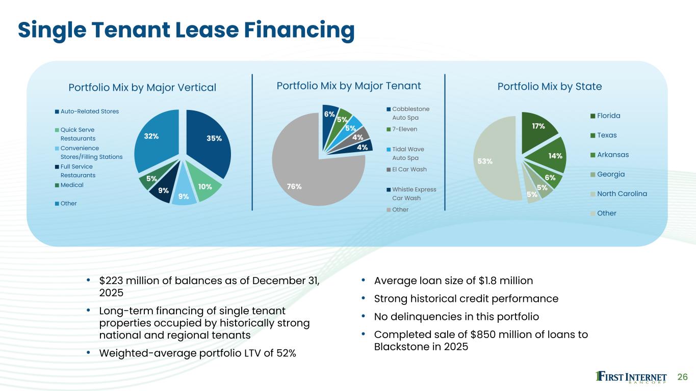 25 Public Finance 34% 13% 12% 10% 7% 24% Portfolio Mix by Repayment Source General Obligation Lease Rental Revenue Essential Use Equipment Loans Water & Sewer Revenue Private Higher Education Other 63%6% 5% 4% 4% 18% Portfolio Mix by State IN OK IA MO OH Other 32% 29% 2% 2% 35% Borrower Mix by Credit Rating A AA BBB AAA Non-Rated • $442 million of balances as of December 31, 2025 • Provides a range of credit solutions for government and not-for-profit entities • Borrower’s needs include short-term financing, debt refinancing, infrastructure improvements, economic development and equipment financing • No delinquencies or loses since inception