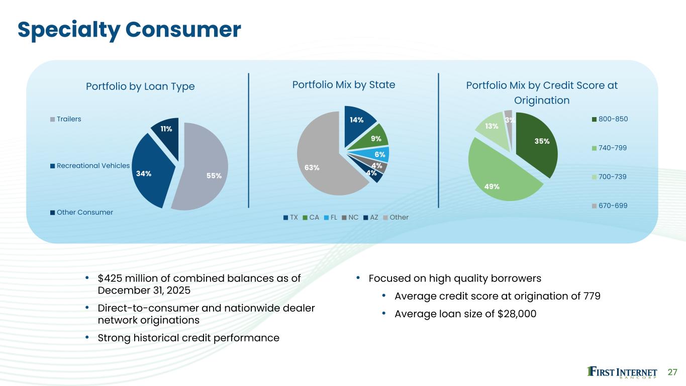 26 Single Tenant Lease Financing 35% 10% 9% 9% 5% 32% Portfolio Mix by Major Vertical Auto-Related Stores Quick Serve Restaurants Convenience Stores/Filling Stations Full Service Restaurants Medical Other 17% 14% 6% 5% 5% 53% Portfolio Mix by State Florida Texas Arkansas Georgia North Carolina Other 6% 5% 5% 4% 4% 76% Portfolio Mix by Major Tenant Cobblestone Auto Spa 7-Eleven Tidal Wave Auto Spa El Car Wash Whistle Express Car Wash Other • $223 million of balances as of December 31, 2025 • Long-term financing of single tenant properties occupied by historically strong national and regional tenants • Weighted-average portfolio LTV of 52% • Average loan size of $1.8 million • Strong historical credit performance • No delinquencies in this portfolio • Completed sale of $850 million of loans to Blackstone in 2025