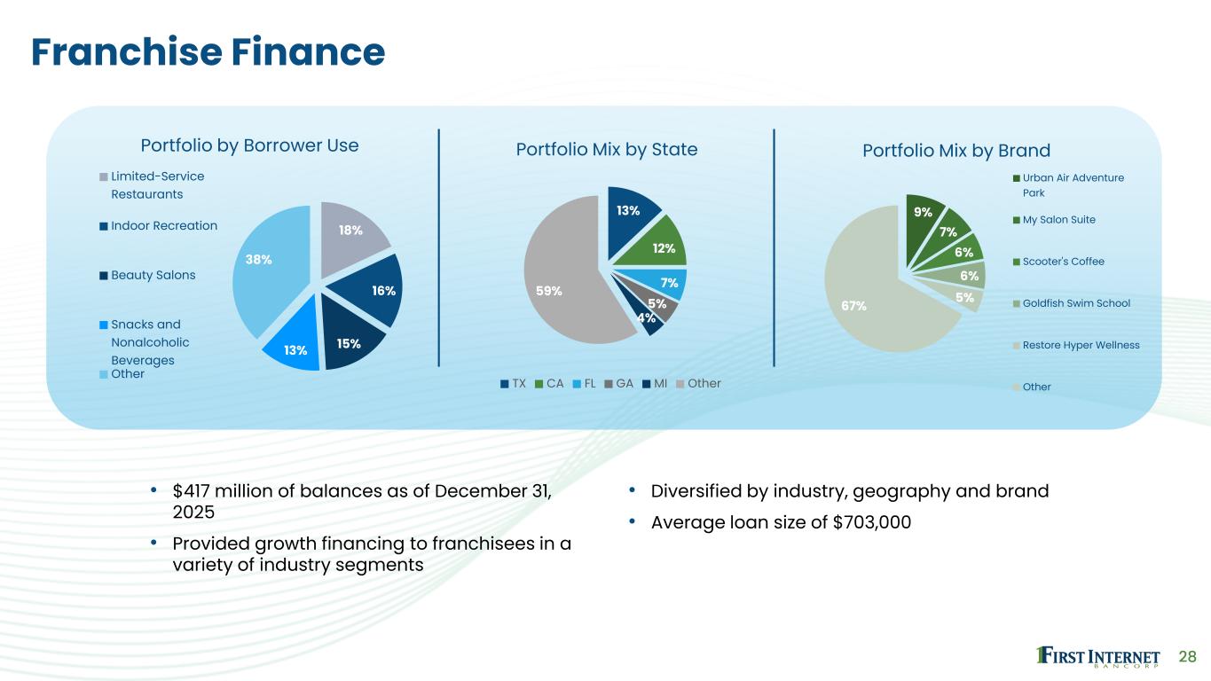 27 Specialty Consumer • $425 million of combined balances as of December 31, 2025 • Direct-to-consumer and nationwide dealer network originations • Strong historical credit performance • Focused on high quality borrowers • Average credit score at origination of 779 • Average loan size of $28,000 55%34% 11% Portfolio by Loan Type Trailers Recreational Vehicles Other Consumer 14% 9% 6% 4% 4% 63% Portfolio Mix by State TX CA FL NC AZ Other 35% 49% 13% 3% Portfolio Mix by Credit Score at Origination 800-850 740-799 700-739 670-699