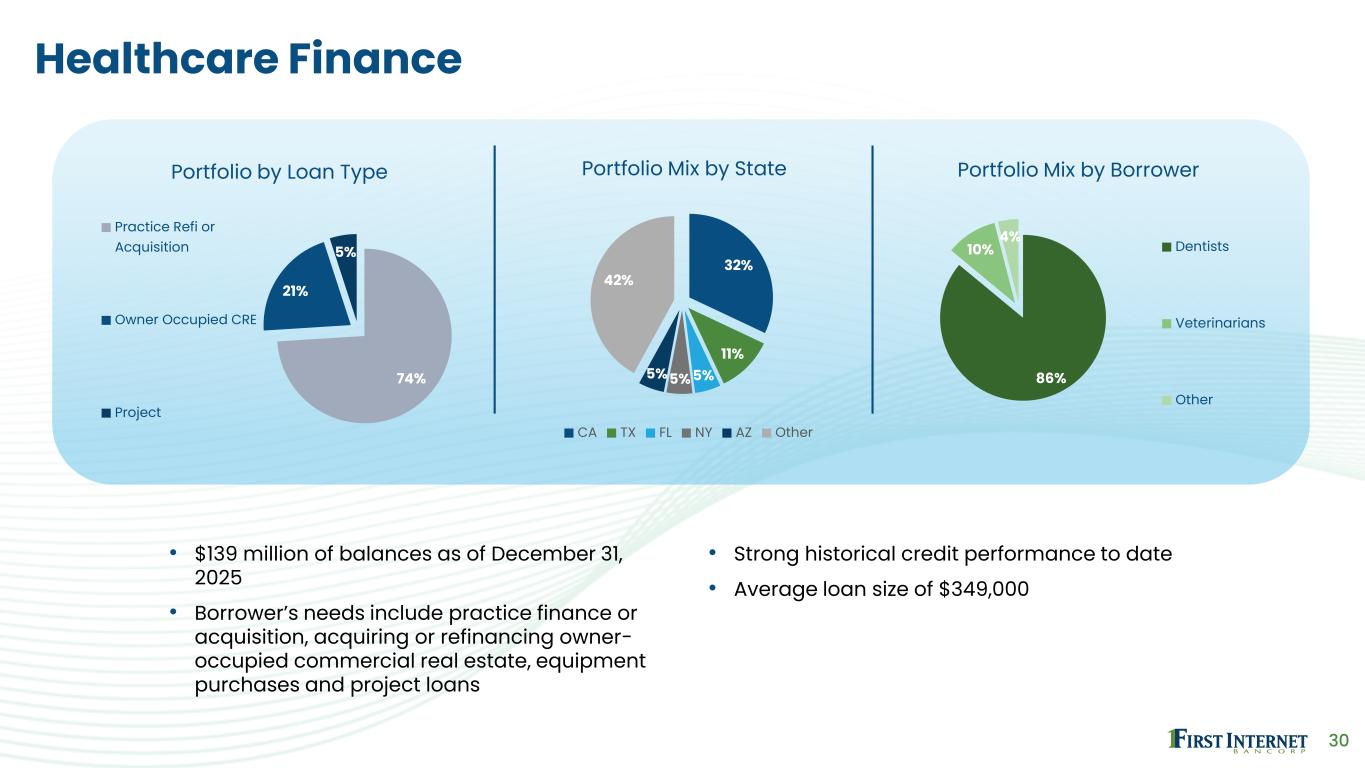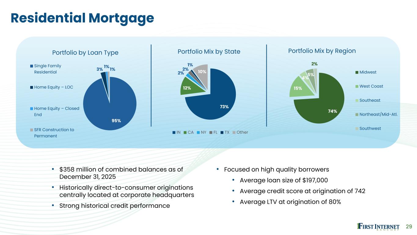 29 Residential Mortgage • $358 million of combined balances as of December 31, 2025 • Historically direct-to-consumer originations centrally located at corporate headquarters • Strong historical credit performance • Focused on high quality borrowers • Average loan size of $197,000 • Average credit score at origination of 742 • Average LTV at origination of 80% 95% 3% 1% 1% Portfolio by Loan Type Single Family Residential Home Equity – LOC Home Equity – Closed End SFR Construction to Permanent 73% 12% 2% 2% 1% 10% Portfolio Mix by State IN CA NY FL TX Other 74% 15% 4% 5% 2% Portfolio Mix by Region Midwest West Coast Southeast Northeast/Mid-Atl. Southwest