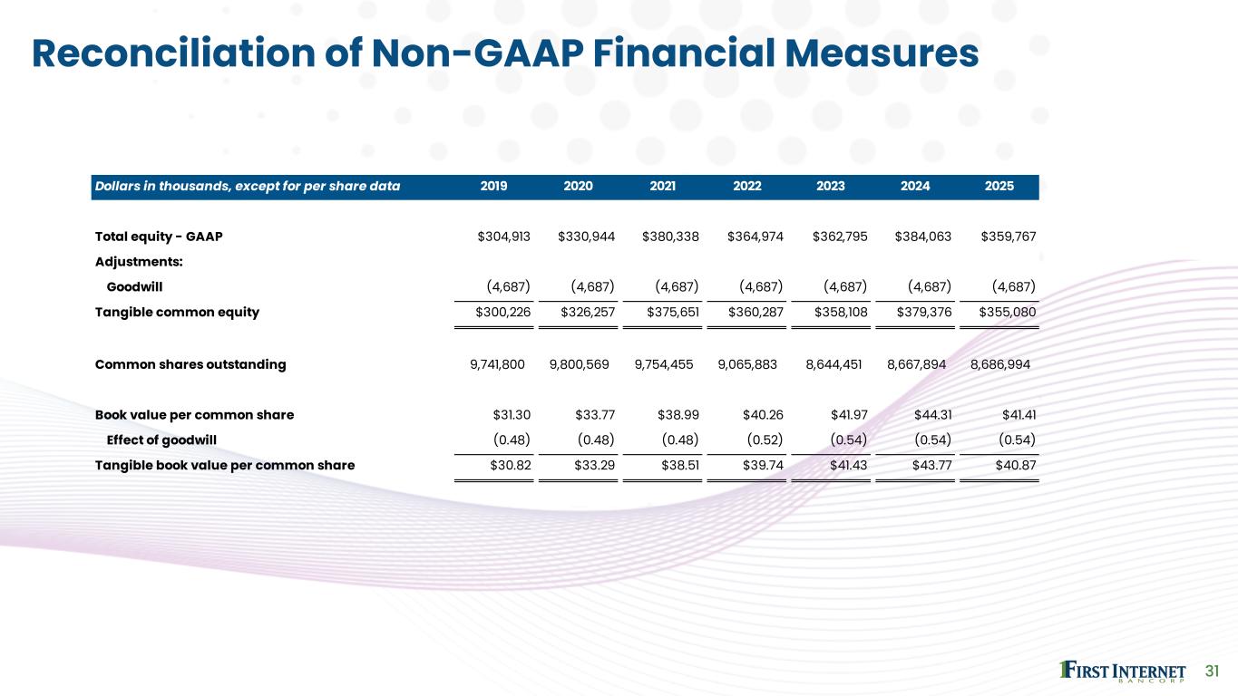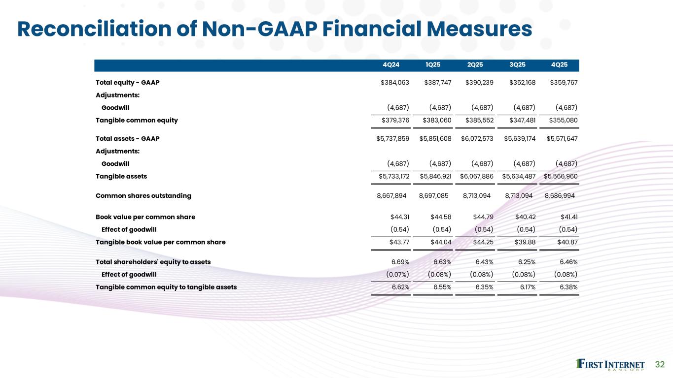 Dollars in thousands, except for per share data 2019 2020 2021 2022 2023 2024 2025 Total equity - GAAP $304,913 $330,944 $380,338 $364,974 $362,795 $384,063 $359,767 Adjustments: Goodwill (4,687) (4,687) (4,687) (4,687) (4,687) (4,687) (4,687) Tangible common equity $300,226 $326,257 $375,651 $360,287 $358,108 $379,376 $355,080 Common shares outstanding 9,741,800 9,800,569 9,754,455 9,065,883 8,644,451 8,667,894 8,686,994 Book value per common share $31.30 $33.77 $38.99 $40.26 $41.97 $44.31 $41.41 Effect of goodwill (0.48) (0.48) (0.48) (0.52) (0.54) (0.54) (0.54) Tangible book value per common share $30.82 $33.29 $38.51 $39.74 $41.43 $43.77 $40.87 31 Reconciliation of Non-GAAP Financial Measures