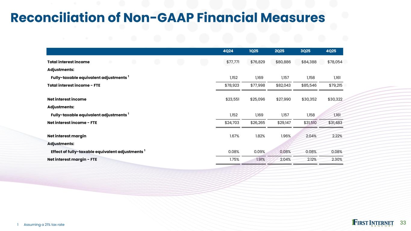 4Q24 1Q25 2Q25 3Q25 4Q25 Total equity - GAAP $384,063 $387,747 $390,239 $352,168 $359,767 Adjustments: Goodwill (4,687) (4,687) (4,687) (4,687) (4,687) Tangible common equity $379,376 $383,060 $385,552 $347,481 $355,080 Total assets - GAAP $5,737,859 $5,851,608 $6,072,573 $5,639,174 $5,571,647 Adjustments: Goodwill (4,687) (4,687) (4,687) (4,687) (4,687) Tangible assets $5,733,172 $5,846,921 $6,067,886 $5,634,487 $5,566,960 Common shares outstanding 8,667,894 8,697,085 8,713,094 8,713,094 8,686,994 Book value per common share $44.31 $44.58 $44.79 $40.42 $41.41 Effect of goodwill (0.54) (0.54) (0.54) (0.54) (0.54) Tangible book value per common share $43.77 $44.04 $44.25 $39.88 $40.87 Total shareholders' equity to assets 6.69% 6.63% 6.43% 6.25% 6.46% Effect of goodwill (0.07%) (0.08%) (0.08%) (0.08%) (0.08%) Tangible common equity to tangible assets 6.62% 6.55% 6.35% 6.17% 6.38% 32 Reconciliation of Non-GAAP Financial Measures
