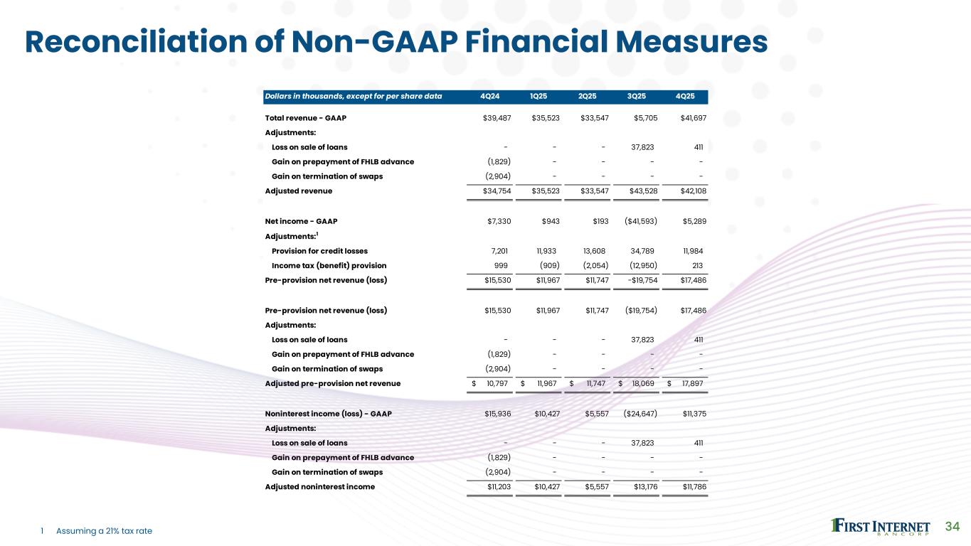 4Q24 1Q25 2Q25 3Q25 4Q25 Total interest income $77,771 $76,829 $80,886 $84,388 $78,054 Adjustments: Fully-taxable equivalent adjustments 1 1,152 1,169 1,157 1,158 1,161 Total interest income - FTE $78,923 $77,998 $82,043 $85,546 $79,215 Net interest income $23,551 $25,096 $27,990 $30,352 $30,322 Adjustments: Fully-taxable equivalent adjustments 1 1,152 1,169 1,157 1,158 1,161 Net interest income - FTE $24,703 $26,265 $29,147 $31,510 $31,483 Net interest margin 1.67% 1.82% 1.96% 2.04% 2.22% Adjustments: Effect of fully-taxable equivalent adjustments 1 0.08% 0.09% 0.08% 0.08% 0.08% Net interest margin - FTE 1.75% 1.91% 2.04% 2.12% 2.30% 33 Reconciliation of Non-GAAP Financial Measures 1 Assuming a 21% tax rate