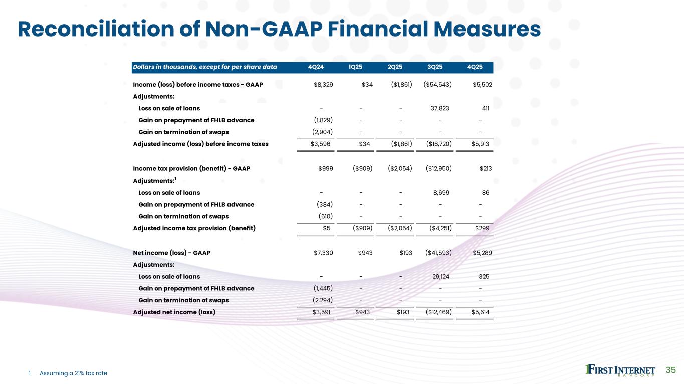 Dollars in thousands, except for per share data 4Q24 1Q25 2Q25 3Q25 4Q25 Total revenue - GAAP $39,487 $35,523 $33,547 $5,705 $41,697 Adjustments: Loss on sale of loans - - - 37,823 411 Gain on prepayment of FHLB advance (1,829) - - - - Gain on termination of swaps (2,904) - - - - Adjusted revenue $34,754 $35,523 $33,547 $43,528 $42,108 Net income - GAAP $7,330 $943 $193 ($41,593) $5,289 Adjustments:1 Provision for credit losses 7,201 11,933 13,608 34,789 11,984 Income tax (benefit) provision 999 (909) (2,054) (12,950) 213 Pre-provision net revenue (loss) $15,530 $11,967 $11,747 -$19,754 $17,486 Pre-provision net revenue (loss) $15,530 $11,967 $11,747 ($19,754) $17,486 Adjustments: Loss on sale of loans - - - 37,823 411 Gain on prepayment of FHLB advance (1,829) - - - - Gain on termination of swaps (2,904) - - - - Adjusted pre-provision net revenue 10,797$ 11,967$ 11,747$ 18,069$ 17,897$ Noninterest income (loss) - GAAP $15,936 $10,427 $5,557 ($24,647) $11,375 Adjustments: Loss on sale of loans - - - 37,823 411 Gain on prepayment of FHLB advance (1,829) - - - - Gain on termination of swaps (2,904) - - - - Adjusted noninterest income $11,203 $10,427 $5,557 $13,176 $11,786 34 Reconciliation of Non-GAAP Financial Measures 1 Assuming a 21% tax rate