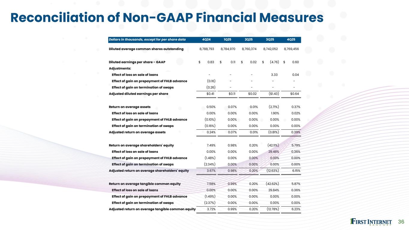 Dollars in thousands, except for per share data 4Q24 1Q25 2Q25 3Q25 4Q25 Income (loss) before income taxes - GAAP $8,329 $34 ($1,861) ($54,543) $5,502 Adjustments: Loss on sale of loans - - - 37,823 411 Gain on prepayment of FHLB advance (1,829) - - - - Gain on termination of swaps (2,904) - - - - Adjusted income (loss) before income taxes $3,596 $34 ($1,861) ($16,720) $5,913 Income tax provision (benefit) - GAAP $999 ($909) ($2,054) ($12,950) $213 Adjustments:1 Loss on sale of loans - - - 8,699 86 Gain on prepayment of FHLB advance (384) - - - - Gain on termination of swaps (610) - - - - Adjusted income tax provision (benefit) $5 ($909) ($2,054) ($4,251) $299 Net income (loss) - GAAP $7,330 $943 $193 ($41,593) $5,289 Adjustments: Loss on sale of loans - - - 29,124 325 Gain on prepayment of FHLB advance (1,445) - - - - Gain on termination of swaps (2,294) - - - - Adjusted net income (loss) $3,591 $943 $193 ($12,469) $5,614 35 Reconciliation of Non-GAAP Financial Measures 1 Assuming a 21% tax rate
