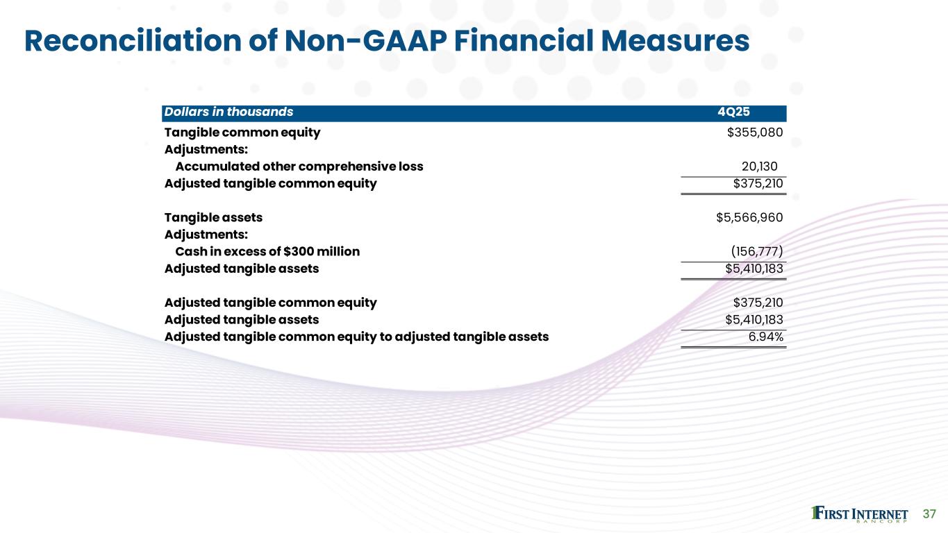 Dollars in thousands, except for per share data 4Q24 1Q25 2Q25 3Q25 4Q25 Diluted average common shares outstanding 8,788,793 8,784,970 8,760,374 8,742,052 8,769,456 Diluted earnings per share - GAAP 0.83$ 0.11$ 0.02$ (4.76)$ 0.60$ Adjustments: Effect of loss on sale of loans - - - 3.33 0.04 Effect of gain on prepayment of FHLB advance (0.16) - - - - Effect of gain on termination of swaps (0.26) - - - - Adjusted diluted earnings per share $0.41 $0.11 $0.02 ($1.43) $0.64 Return on average assets 0.50% 0.07% 0.01% (2.71%) 0.37% Effect of loss on sale of loans 0.00% 0.00% 0.00% 1.90% 0.02% Effect of gain on prepayment of FHLB advance (0.10%) 0.00% 0.00% 0.00% 0.00% Effect of gain on termination of swaps (0.16%) 0.00% 0.00% 0.00% 0.00% Adjusted return on average assets 0.24% 0.07% 0.01% (0.81%) 0.39% Return on average shareholders' equity 7.49% 0.98% 0.20% (42.11%) 5.79% Effect of loss on sale of loans 0.00% 0.00% 0.00% 29.48% 0.36% Effect of gain on prepayment of FHLB advance (1.48%) 0.00% 0.00% 0.00% 0.00% Effect of gain on termination of swaps (2.34%) 0.00% 0.00% 0.00% 0.00% Adjusted return on average shareholders' equity 3.67% 0.98% 0.20% (12.63%) 6.15% Return on average tangible common equity 7.58% 0.99% 0.20% (42.62%) 5.87% Effect of loss on sale of loans 0.00% 0.00% 0.00% 29.84% 0.36% Effect of gain on prepayment of FHLB advance (1.49%) 0.00% 0.00% 0.00% 0.00% Effect of gain on termination of swaps (2.37%) 0.00% 0.00% 0.00% 0.00% Adjusted return on average tangible common equity 3.72% 0.99% 0.20% (12.78%) 6.23% 36 Reconciliation of Non-GAAP Financial Measures