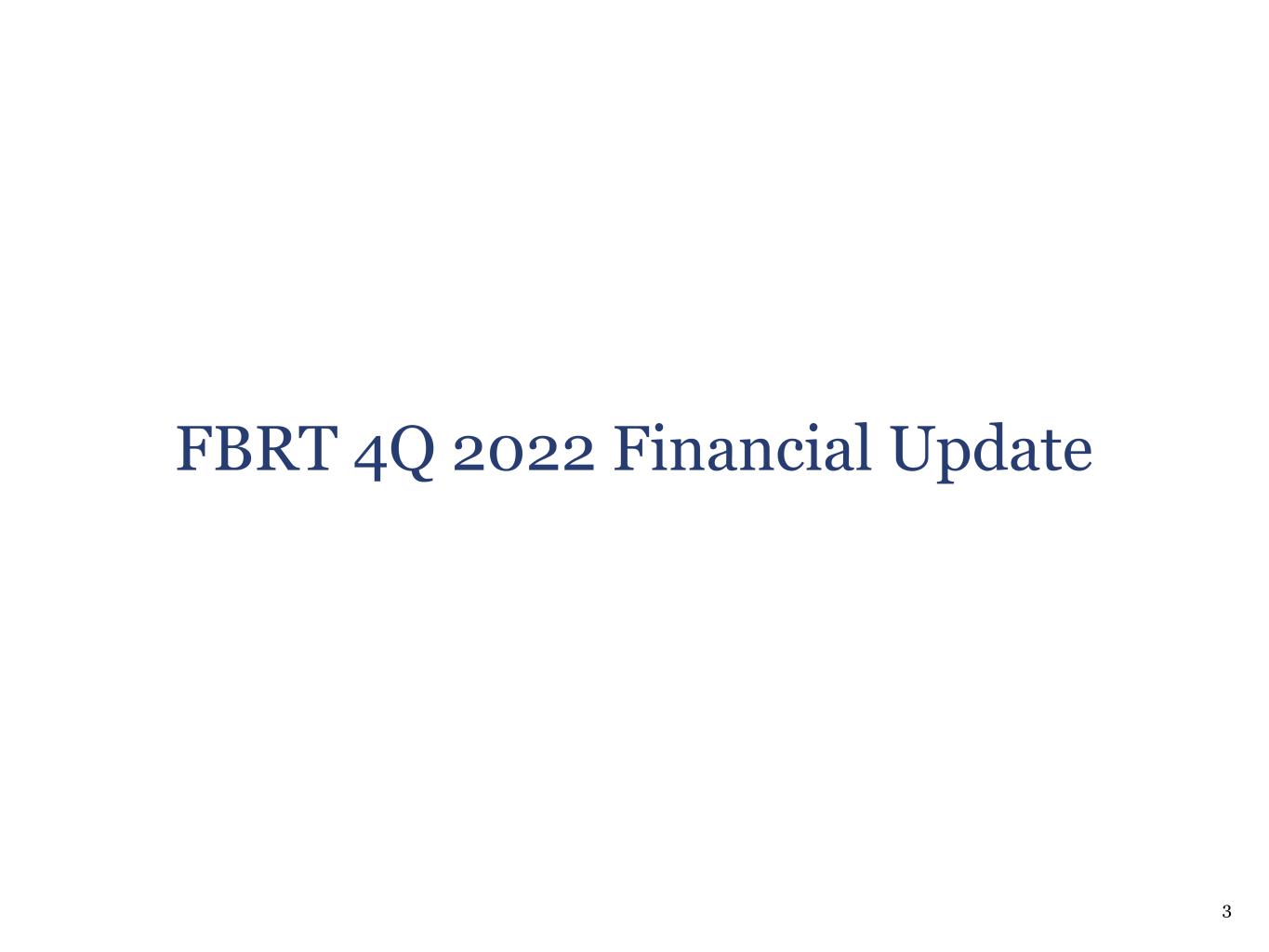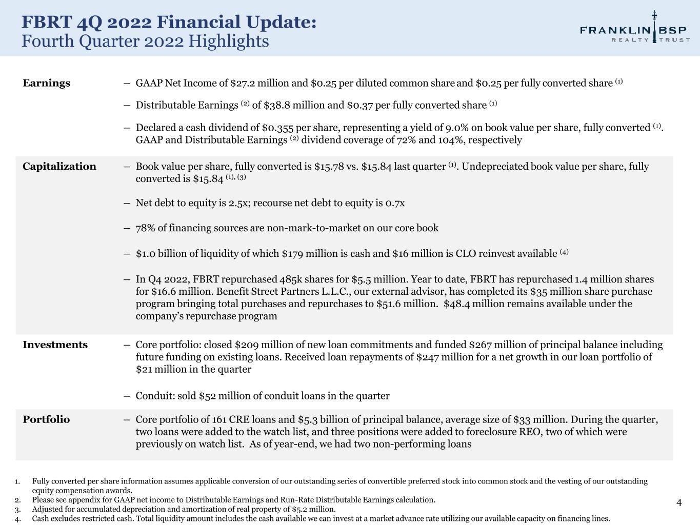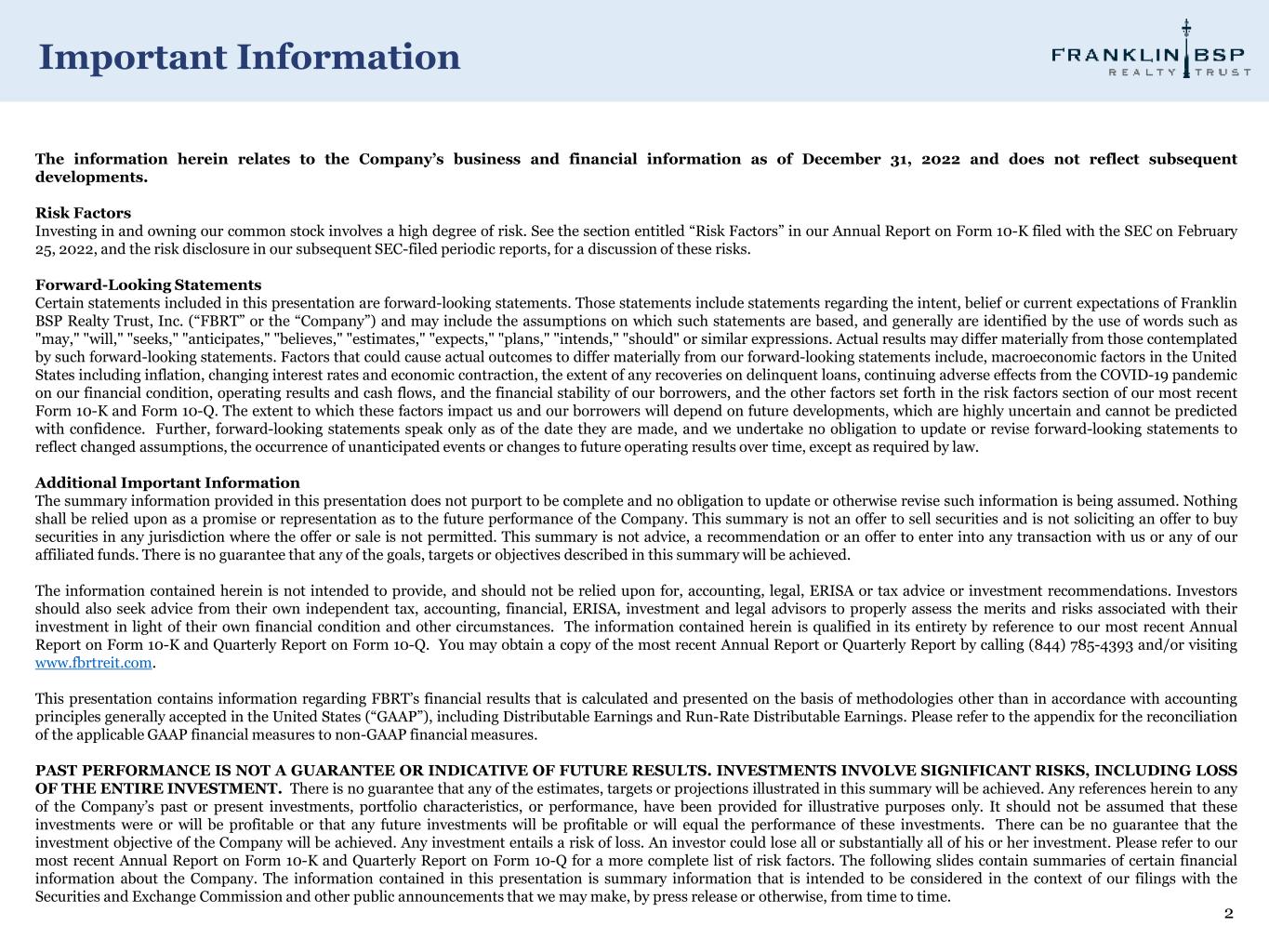Important Information 2 The information herein relates to the Company’s business and financial information as of December 31, 2022 and does not reflect subsequent developments. Risk Factors Investing in and owning our common stock involves a high degree of risk. See the section entitled “Risk Factors” in our Annual Report on Form 10-K filed with the SEC on February 25, 2022, and the risk disclosure in our subsequent SEC-filed periodic reports, for a discussion of these risks. Forward-Looking Statements Certain statements included in this presentation are forward-looking statements. Those statements include statements regarding the intent, belief or current expectations of Franklin BSP Realty Trust, Inc. (“FBRT” or the “Company”) and may include the assumptions on which such statements are based, and generally are identified by the use of words such as "may," "will," "seeks," "anticipates," "believes," "estimates," "expects," "plans," "intends," "should" or similar expressions. Actual results may differ materially from those contemplated by such forward-looking statements. Factors that could cause actual outcomes to differ materially from our forward-looking statements include, macroeconomic factors in the United States including inflation, changing interest rates and economic contraction, the extent of any recoveries on delinquent loans, continuing adverse effects from the COVID-19 pandemic on our financial condition, operating results and cash flows, and the financial stability of our borrowers, and the other factors set forth in the risk factors section of our most recent Form 10-K and Form 10-Q. The extent to which these factors impact us and our borrowers will depend on future developments, which are highly uncertain and cannot be predicted with confidence. Further, forward-looking statements speak only as of the date they are made, and we undertake no obligation to update or revise forward-looking statements to reflect changed assumptions, the occurrence of unanticipated events or changes to future operating results over time, except as required by law. Additional Important Information The summary information provided in this presentation does not purport to be complete and no obligation to update or otherwise revise such information is being assumed. Nothing shall be relied upon as a promise or representation as to the future performance of the Company. This summary is not an offer to sell securities and is not soliciting an offer to buy securities in any jurisdiction where the offer or sale is not permitted. This summary is not advice, a recommendation or an offer to enter into any transaction with us or any of our affiliated funds. There is no guarantee that any of the goals, targets or objectives described in this summary will be achieved. The information contained herein is not intended to provide, and should not be relied upon for, accounting, legal, ERISA or tax advice or investment recommendations. Investors should also seek advice from their own independent tax, accounting, financial, ERISA, investment and legal advisors to properly assess the merits and risks associated with their investment in light of their own financial condition and other circumstances. The information contained herein is qualified in its entirety by reference to our most recent Annual Report on Form 10-K and Quarterly Report on Form 10-Q. You may obtain a copy of the most recent Annual Report or Quarterly Report by calling (844) 785-4393 and/or visiting www.fbrtreit.com. This presentation contains information regarding FBRT’s financial results that is calculated and presented on the basis of methodologies other than in accordance with accounting principles generally accepted in the United States (“GAAP”), including Distributable Earnings and Run-Rate Distributable Earnings. Please refer to the appendix for the reconciliation of the applicable GAAP financial measures to non-GAAP financial measures. PAST PERFORMANCE IS NOT A GUARANTEE OR INDICATIVE OF FUTURE RESULTS. INVESTMENTS INVOLVE SIGNIFICANT RISKS, INCLUDING LOSS OF THE ENTIRE INVESTMENT. There is no guarantee that any of the estimates, targets or projections illustrated in this summary will be achieved. Any references herein to any of the Company’s past or present investments, portfolio characteristics, or performance, have been provided for illustrative purposes only. It should not be assumed that these investments were or will be profitable or that any future investments will be profitable or will equal the performance of these investments. There can be no guarantee that the investment objective of the Company will be achieved. Any investment entails a risk of loss. An investor could lose all or substantially all of his or her investment. Please refer to our most recent Annual Report on Form 10-K and Quarterly Report on Form 10-Q for a more complete list of risk factors. The following slides contain summaries of certain financial information about the Company. The information contained in this presentation is summary information that is intended to be considered in the context of our filings with the Securities and Exchange Commission and other public announcements that we may make, by press release or otherwise, from time to time.