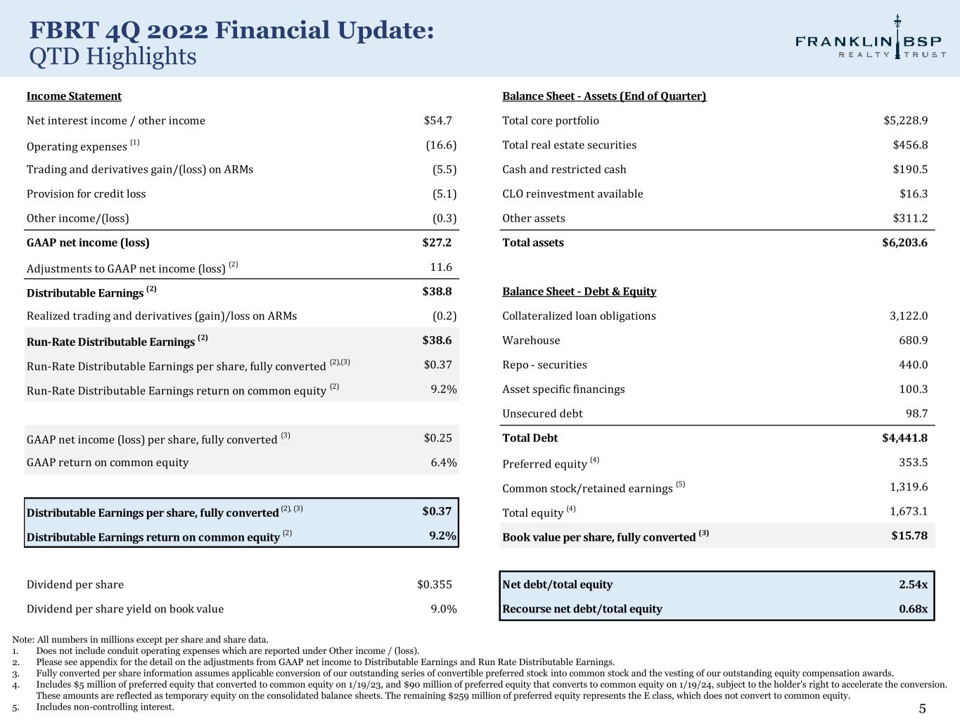 FBRT 4Q 2022 Financial Update: Fourth Quarter 2022 Highlights 4 1. Fully converted per share information assumes applicable conversion of our outstanding series of convertible preferred stock into common stock and the vesting of our outstanding equity compensation awards. 2. Please see appendix for GAAP net income to Distributable Earnings and Run-Rate Distributable Earnings calculation. 3. Adjusted for accumulated depreciation and amortization of real property of $5.2 million. 4. Cash excludes restricted cash. Total liquidity amount includes the cash available we can invest at a market advance rate utilizing our available capacity on financing lines. Earnings ― GAAP Net Income of $27.2 million and $0.25 per diluted common share and $0.25 per fully converted share (1) ― Distributable Earnings (2) of $38.8 million and $0.37 per fully converted share (1) ― Declared a cash dividend of $0.355 per share, representing a yield of 9.0% on book value per share, fully converted (1). GAAP and Distributable Earnings (2) dividend coverage of 72% and 104%, respectively Capitalization ― Book value per share, fully converted is $15.78 vs. $15.84 last quarter (1). Undepreciated book value per share, fully converted is $15.84 (1), (3) ― Net debt to equity is 2.5x; recourse net debt to equity is 0.7x ― 78% of financing sources are non-mark-to-market on our core book ― $1.0 billion of liquidity of which $179 million is cash and $16 million is CLO reinvest available (4) ― In Q4 2022, FBRT repurchased 485k shares for $5.5 million. Year to date, FBRT has repurchased 1.4 million shares for $16.6 million. Benefit Street Partners L.L.C., our external advisor, has completed its $35 million share purchase program bringing total purchases and repurchases to $51.6 million. $48.4 million remains available under the company’s repurchase program Investments ― Core portfolio: closed $209 million of new loan commitments and funded $267 million of principal balance including future funding on existing loans. Received loan repayments of $247 million for a net growth in our loan portfolio of $21 million in the quarter ― Conduit: sold $52 million of conduit loans in the quarter Portfolio ― Core portfolio of 161 CRE loans and $5.3 billion of principal balance, average size of $33 million. During the quarter, two loans were added to the watch list, and three positions were added to foreclosure REO, two of which were previously on watch list. As of year-end, we had two non-performing loans