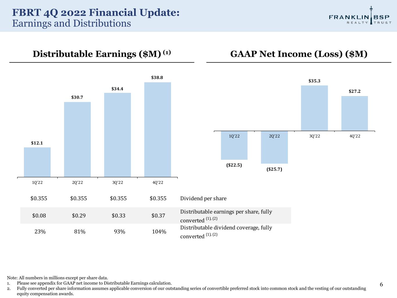 FBRT 4Q 2022 Financial Update: QTD Highlights 5 Note: All numbers in millions except per share and share data. 1. Does not include conduit operating expenses which are reported under Other income / (loss). 2. Please see appendix for the detail on the adjustments from GAAP net income to Distributable Earnings and Run Rate Distributable Earnings. 3. Fully converted per share information assumes applicable conversion of our outstanding series of convertible preferred stock into common stock and the vesting of our outstanding equity compensation awards. 4. Includes $5 million of preferred equity that converted to common equity on 1/19/23, and $90 million of preferred equity that converts to common equity on 1/19/24, subject to the holder's right to accelerate the conversion. These amounts are reflected as temporary equity on the consolidated balance sheets. The remaining $259 million of preferred equity represents the E class, which does not convert to common equity. 5. Includes non-controlling interest. Income Statement Balance Sheet - Assets (End of Quarter) Net interest income / other income $54.7 Total core portfolio $5,228.9 Operating expenses (1) (16.6) Total real estate securities $456.8 Trading and derivatives gain/(loss) on ARMs (5.5) Cash and restricted cash $190.5 Provision for credit loss (5.1) CLO reinvestment available $16.3 Other income/(loss) (0.3) Other assets $311.2 GAAP net income (loss) $27.2 Total assets $6,203.6 Adjustments to GAAP net income (loss) (2) 11.6 Distributable Earnings (2) $38.8 Balance Sheet - Debt & Equity Realized trading and derivatives (gain)/loss on ARMs (0.2) Collateralized loan obligations 3,122.0 Run-Rate Distributable Earnings (2) $38.6 Warehouse 680.9 Run-Rate Distributable Earnings per share, fully converted (2),(3) $0.37 Repo - securities 440.0 Run-Rate Distributable Earnings return on common equity (2) 9.2% Asset specific financings 100.3 Unsecured debt 98.7 GAAP net income (loss) per share, fully converted (3) $0.25 Total Debt $4,441.8 GAAP return on common equity 6.4% Preferred equity (4) 353.5 Common stock/retained earnings (5) 1,319.6 Distributable Earnings per share, fully converted (2), (3) $0.37 Total equity (4) 1,673.1 Distributable Earnings return on common equity (2) 9.2% Book value per share, fully converted (3) $15.78 Dividend per share $0.355 Net debt/total equity 2.54x Dividend per share yield on book value 9.0% Recourse net debt/total equity 0.68x