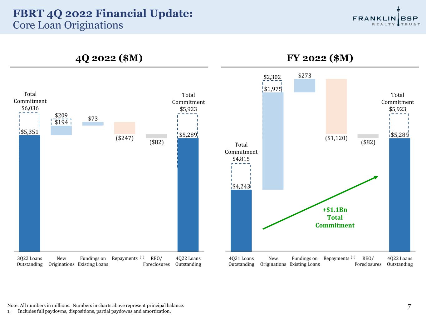 FBRT 4Q 2022 Financial Update: Earnings and Distributions 6 Note: All numbers in millions except per share data. 1. Please see appendix for GAAP net income to Distributable Earnings calculation. 2. Fully converted per share information assumes applicable conversion of our outstanding series of convertible preferred stock into common stock and the vesting of our outstanding equity compensation awards. $12.1 $30.7 $34.4 $38.8 1Q'22 2Q'22 3Q'22 4Q'22 GAAP Net Income (Loss) ($M)Distributable Earnings ($M) (1) ($22.5) ($25.7) $35.3 $27.2 1Q'22 2Q'22 3Q'22 4Q'22 $0.355 $0.355 $0.355 $0.355 Dividend per share $0.08 $0.29 $0.33 $0.37 Distributable earnings per share, fully converted (1), (2) 23% 81% 93% 104% Distributable dividend coverage, fully converted (1), (2)