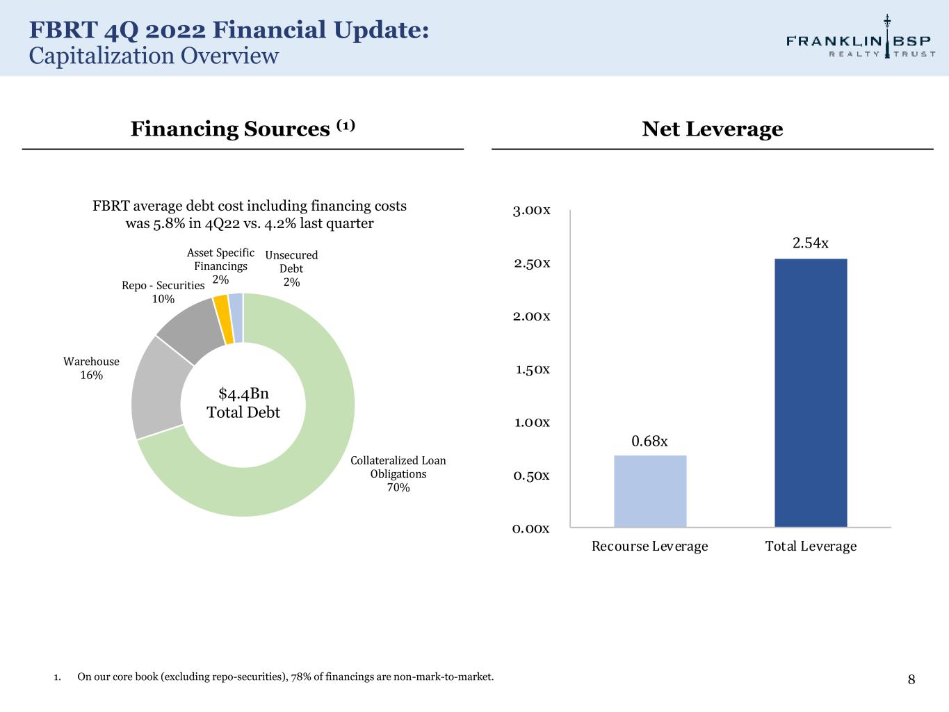FBRT 4Q 2022 Financial Update: Core Loan Originations 7Note: All numbers in millions. Numbers in charts above represent principal balance. 1. Includes full paydowns, dispositions, partial paydowns and amortization. 4Q 2022 ($M) FY 2022 ($M) Total Commitment $5,923 $209 Total Commitment $6,036 (1)(1) Total Commitment $4,815 $2,302 Total Commitment $5,923 +$1.1Bn Total Commitment
