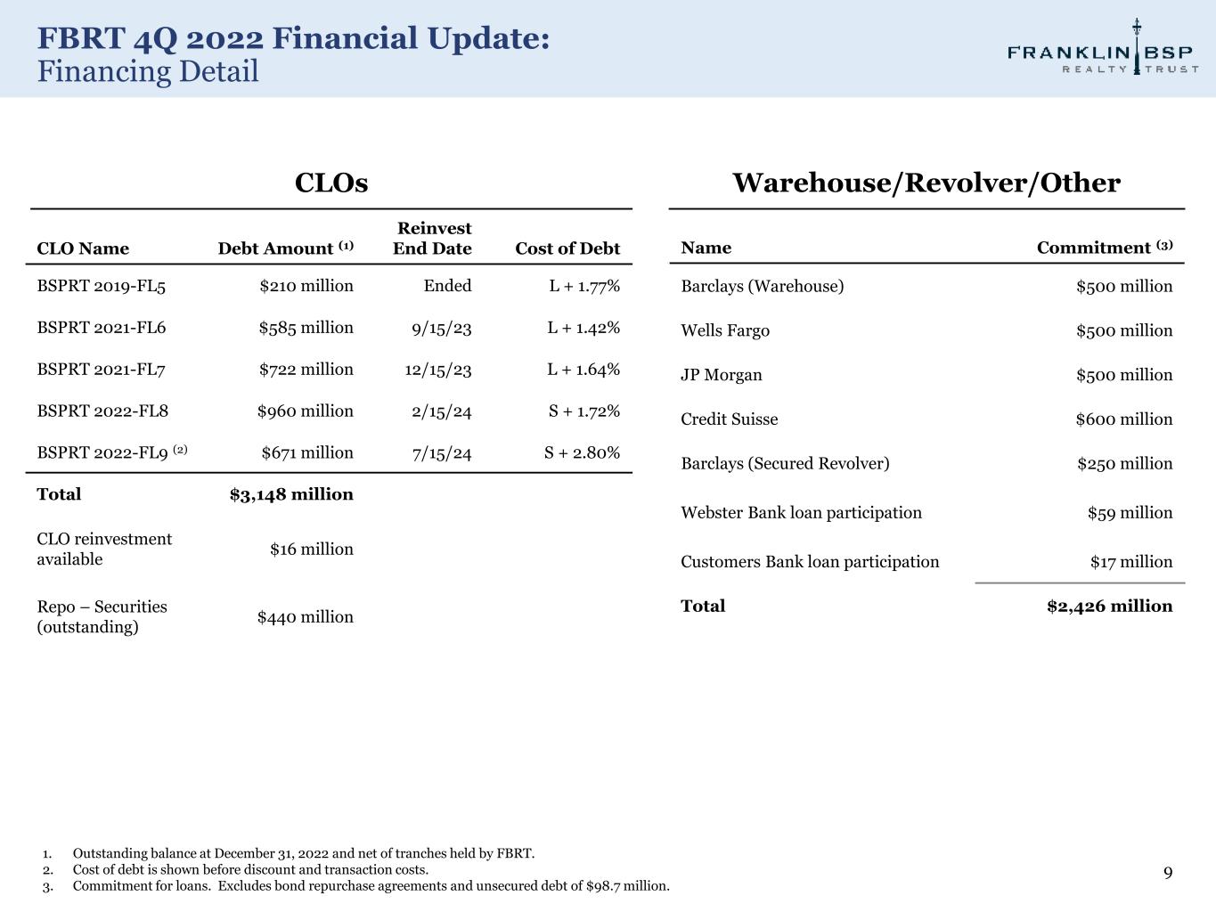 FBRT 4Q 2022 Financial Update: Capitalization Overview 1. On our core book (excluding repo-securities), 78% of financings are non-mark-to-market. 8 Collateralized Loan Obligations 70% Warehouse 16% Repo - Securities 10% Asset Specific Financings 2% Unsecured Debt 2% FBRT average debt cost including financing costs was 5.8% in 4Q22 vs. 4.2% last quarter $4.4Bn Total Debt 0.68x 2.54x 0.00x 0.50x 1.00x 1.50x 2.00x 2.50x 3.00x Recourse Leverage Total Leverage Financing Sources (1) Net Leverage