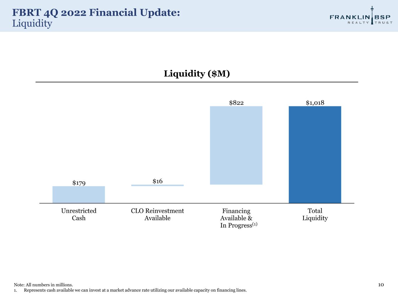 FBRT 4Q 2022 Financial Update: Financing Detail 9 1. Outstanding balance at December 31, 2022 and net of tranches held by FBRT. 2. Cost of debt is shown before discount and transaction costs. 3. Commitment for loans. Excludes bond repurchase agreements and unsecured debt of $98.7 million. CLO Name Debt Amount (1) Reinvest End Date Cost of Debt BSPRT 2019-FL5 $210 million Ended L + 1.77% BSPRT 2021-FL6 $585 million 9/15/23 L + 1.42% BSPRT 2021-FL7 $722 million 12/15/23 L + 1.64% BSPRT 2022-FL8 $960 million 2/15/24 S + 1.72% BSPRT 2022-FL9 (2) $671 million 7/15/24 S + 2.80% Total $3,148 million CLO reinvestment available $16 million Repo – Securities (outstanding) $440 million Name Commitment (3) Barclays (Warehouse) $500 million Wells Fargo $500 million JP Morgan $500 million Credit Suisse $600 million Barclays (Secured Revolver) $250 million Webster Bank loan participation $59 million Customers Bank loan participation $17 million Total $2,426 million CLOs Warehouse/Revolver/Other