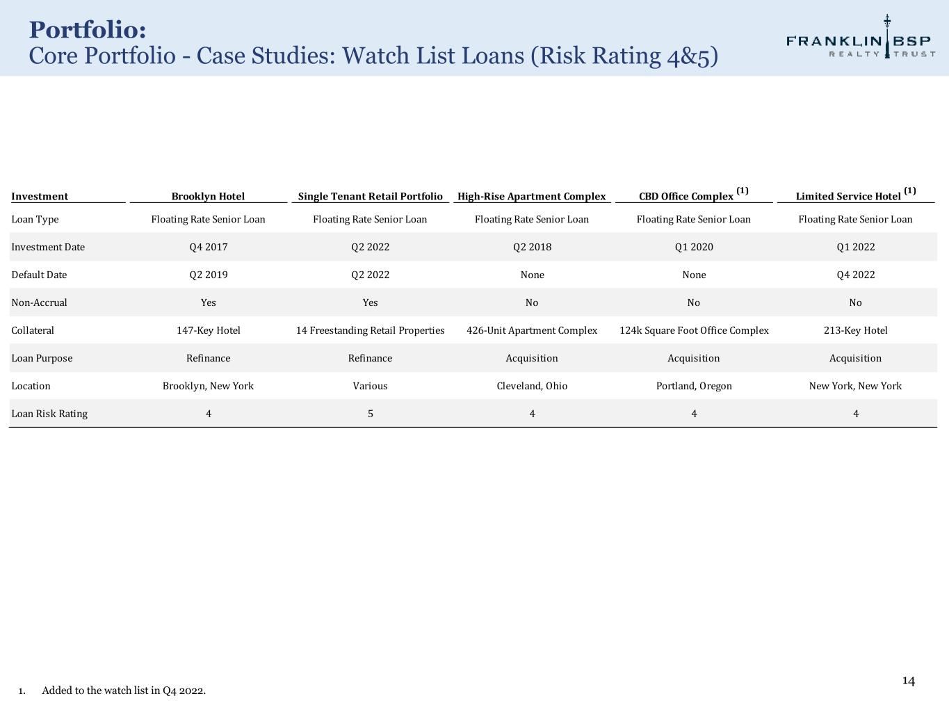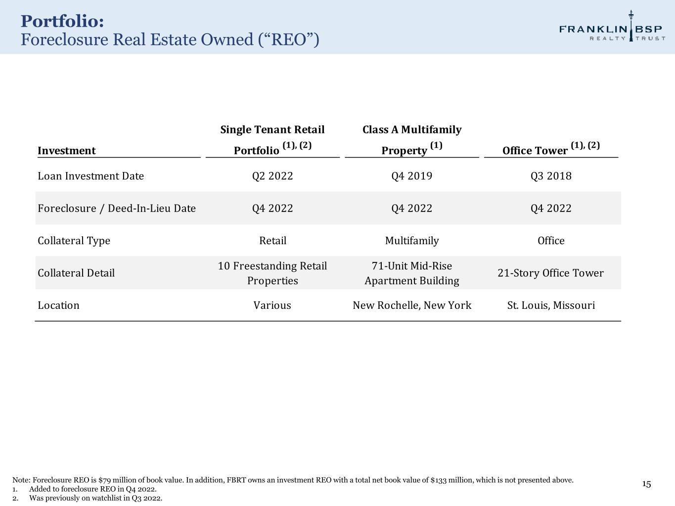 Portfolio: Core Portfolio - Case Studies: Watch List Loans (Risk Rating 4&5) 14 Investment Brooklyn Hotel Single Tenant Retail Portfolio High-Rise Apartment Complex CBD Office Complex (1) Limited Service Hotel (1) Loan Type Floating Rate Senior Loan Floating Rate Senior Loan Floating Rate Senior Loan Floating Rate Senior Loan Floating Rate Senior Loan Investment Date Q4 2017 Q2 2022 Q2 2018 Q1 2020 Q1 2022 Default Date Q2 2019 Q2 2022 None None Q4 2022 Non-Accrual Yes Yes No No No Collateral 147-Key Hotel 14 Freestanding Retail Properties 426-Unit Apartment Complex 124k Square Foot Office Complex 213-Key Hotel Loan Purpose Refinance Refinance Acquisition Acquisition Acquisition Location Brooklyn, New York Various Cleveland, Ohio Portland, Oregon New York, New York Loan Risk Rating 4 5 4 4 4 1. Added to the watch list in Q4 2022.