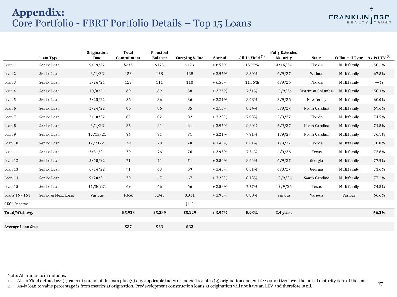 Appendix: Core Portfolio - FBRT Portfolio Details – Top 15 Loans 17 Note: All numbers in millions. 1. All-in Yield defined as: (1) current spread of the loan plus (2) any applicable index or index floor plus (3) origination and exit fees amortized over the initial maturity date of the loan. 2. As-is loan to value percentage is from metrics at origination. Predevelopment construction loans at origination will not have an LTV and therefore is nil. Loan Type Origination Date Total Commitment Principal Balance Carrying Value Spread All-in Yield (1) Fully Extended Maturity State Collateral Type As-is LTV (2) Loan 1 Senior Loan 9/19/22 $235 $173 $173 + 6.52% 13.07% 4/16/24 Florida Multifamily 50.1% Loan 2 Senior Loan 6/1/22 153 128 128 + 3.95% 8.80% 6/9/27 Various Multifamily 67.8% Loan 3 Senior Loan 5/26/21 129 111 110 + 6.50% 11.55% 6/9/26 Florida Multifamily —% Loan 4 Senior Loan 10/8/21 89 89 88 + 2.75% 7.31% 10/9/26 District of Columbia Multifamily 50.3% Loan 5 Senior Loan 2/25/22 86 86 86 + 3.24% 8.08% 3/9/26 New Jersey Multifamily 60.0% Loan 6 Senior Loan 2/24/22 86 86 85 + 3.15% 8.24% 3/9/27 North Carolina Multifamily 69.6% Loan 7 Senior Loan 2/10/22 82 82 82 + 3.20% 7.93% 2/9/27 Florida Multifamily 74.5% Loan 8 Senior Loan 6/1/22 86 81 81 + 3.95% 8.80% 6/9/27 North Carolina Multifamily 71.8% Loan 9 Senior Loan 12/15/21 84 81 81 + 3.21% 7.81% 1/9/27 North Carolina Multifamily 76.1% Loan 10 Senior Loan 12/21/21 79 78 78 + 3.45% 8.01% 1/9/27 Florida Multifamily 78.8% Loan 11 Senior Loan 3/31/21 79 76 76 + 2.95% 7.54% 4/9/26 Texas Multifamily 72.6% Loan 12 Senior Loan 5/18/22 71 71 71 + 3.80% 8.64% 6/9/27 Georgia Multifamily 77.9% Loan 13 Senior Loan 6/14/22 71 69 69 + 3.45% 8.61% 6/9/27 Georgia Multifamily 71.6% Loan 14 Senior Loan 9/20/21 70 67 67 + 3.25% 8.13% 10/9/26 South Carolina Multifamily 77.1% Loan 15 Senior Loan 11/30/21 69 66 66 + 2.88% 7.77% 12/9/26 Texas Multifamily 74.8% Loans 16 - 161 Senior & Mezz Loans Various 4,456 3,945 3,931 + 3.95% 8.88% Various Various Various 66.6% CECL Reserve (41) Total/Wtd. avg. $5,923 $5,289 $5,229 + 3.97% 8.93% 3.4 years 66.2% Average Loan Size $37 $33 $32