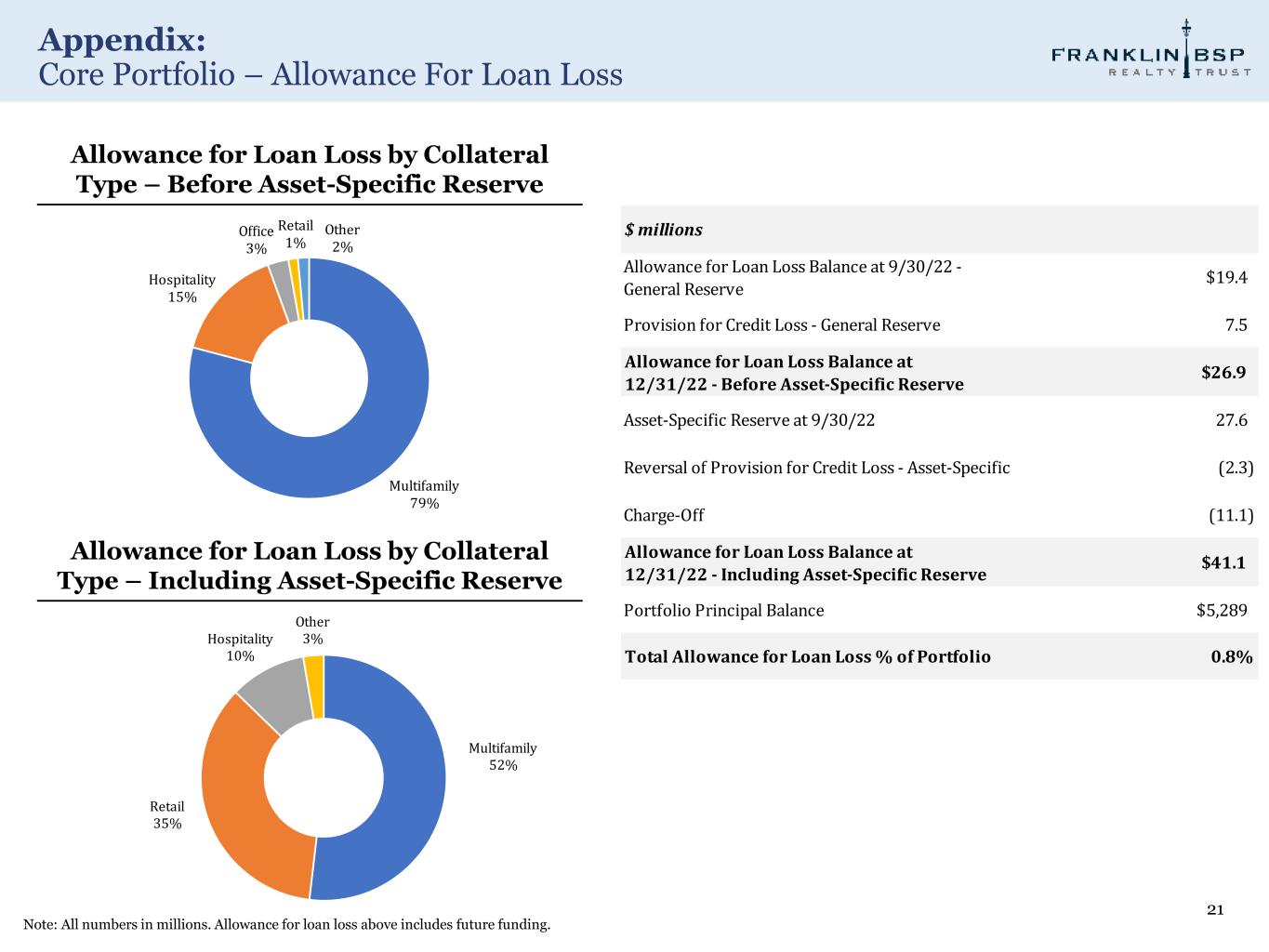 Appendix: Core Portfolio – Allowance For Loan Loss 21 Note: All numbers in millions. Allowance for loan loss above includes future funding. Allowance for Loan Loss by Collateral Type – Before Asset-Specific Reserve Allowance for Loan Loss by Collateral Type – Including Asset-Specific Reserve Multifamily 79% Hospitality 15% Office 3% Retail 1% Other 2% Multifamily 52% Retail 35% Hospitality 10% Other 3% $ millions Allowance for Loan Loss Balance at 9/30/22 - General Reserve $19.4 Provision for Credit Loss - General Reserve 7.5 Allowance for Loan Loss Balance at 12/31/22 - Before Asset-Specific Reserve $26.9 Asset-Specific Reserve at 9/30/22 27.6 Reversal of Provision for Credit Loss - Asset-Specific (2.3) Charge-Off (11.1) Allowance for Loan Loss Balance at 12/31/22 - Including Asset-Specific Reserve $41.1 Portfolio Principal Balance $5,289 Total Allowance for Loan Loss % of Portfolio 0.8%
