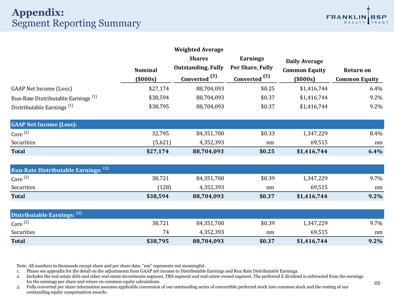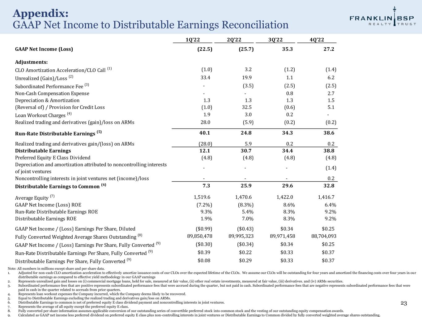 Appendix: Segment Reporting Summary 22 Note: All numbers in thousands except share and per share data. “nm” represents not meaningful. 1. Please see appendix for the detail on the adjustments from GAAP net income to Distributable Earnings and Run Rate Distributable Earnings. 2. Includes the real estate debt and other real estate investments segment, TRS segment and real estate owned segment. The preferred E dividend is subtracted from the earnings for the earnings per share and return on common equity calculations. 3. Fully converted per share information assumes applicable conversion of our outstanding series of convertible preferred stock into common stock and the vesting of our outstanding equity compensation awards. Nominal ($000s) Weighted Average Shares Outstanding, Fully Converted (3) Earnings Per Share, Fully Converted (3) Daily Average Common Equity ($000s) Return on Common Equity GAAP Net Income (Loss) $27,174 88,704,093 $0.25 $1,416,744 6.4% Run-Rate Distributable Earnings (1) $38,594 88,704,093 $0.37 $1,416,744 9.2% Distributable Earnings (1) $38,795 88,704,093 $0.37 $1,416,744 9.2% GAAP Net Income (Loss): Core (2) 32,795 84,351,700 $0.33 1,347,229 8.4% Securities (5,621) 4,352,393 nm 69,515 nm Total $27,174 88,704,093 $0.25 $1,416,744 6.4% Run-Rate Distributable Earnings: (1) Core (2) 38,721 84,351,700 $0.39 1,347,229 9.7% Securities (128) 4,352,393 nm 69,515 nm Total $38,594 88,704,093 $0.37 $1,416,744 9.2% Distributable Earnings: (1) Core (2) 38,721 84,351,700 $0.39 1,347,229 9.7% Securities 74 4,352,393 nm 69,515 nm Total $38,795 88,704,093 $0.37 $1,416,744 9.2%