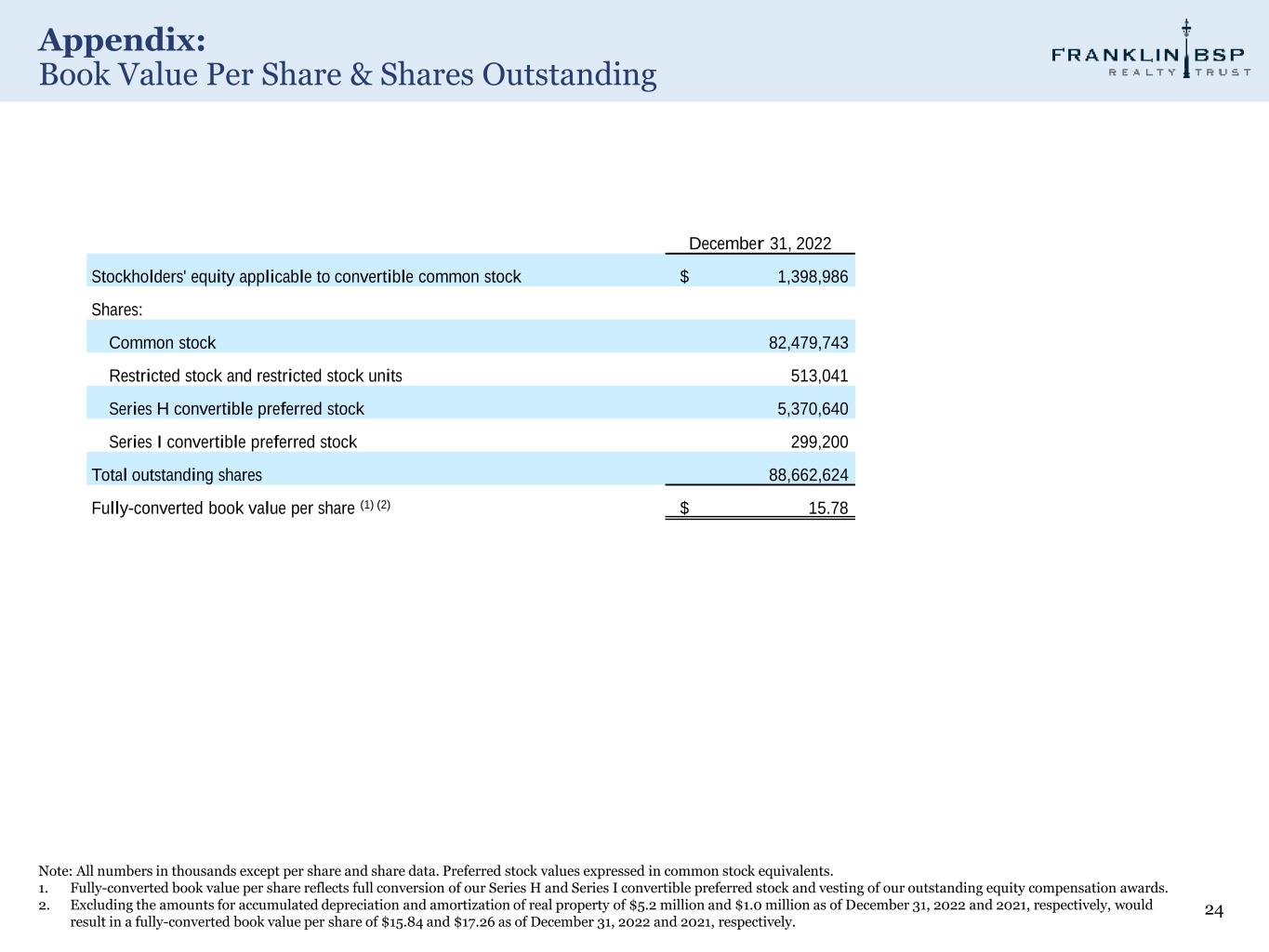 Appendix: GAAP Net Income to Distributable Earnings Reconciliation 23 Note: All numbers in millions except share and per share data. 1. Adjusted for non-cash CLO amortization acceleration to effectively amortize issuance costs of our CLOs over the expected lifetime of the CLOs. We assume our CLOs will be outstanding for four years and amortized the financing costs over four years in our distributable earnings as compared to effective yield methodology in our GAAP earnings 2. Represents unrealized gain and losses on (i) commercial mortgage loans, held for sale, measured at fair value, (ii) other real estate investments, measured at fair value, (iii) derivatives. and (iv) ARMs securities. 3. Subordinated performance fees that are positive represents subordinated performance fees that were accrued during the quarter, but not paid in cash. Subordinated performance fees that are negative represents subordinated performance fees that were paid in cash in the quarter related to accruals from prior quarters. 4. Represents loan workout expenses the Company incurred, which the Company deems likely to be recovered. 5. Equal to Distributable Earnings excluding the realized trading and derivatives gain/loss on ARMs. 6. Distributable Earnings to common is net of preferred equity E class dividend payment and noncontrolling interests in joint ventures. 7. Represents the average of all equity except the preferred equity E class. 8. Fully converted per share information assumes applicable conversion of our outstanding series of convertible preferred stock into common stock and the vesting of our outstanding equity compensation awards. 9. Calculated as GAAP net income less preferred dividend on preferred equity E class plus non-controlling interests in joint ventures or Distributable Earnings to Common divided by fully converted weighted average shares outstanding. 1Q'22 2Q'22 3Q'22 4Q'22 GAAP Net Income (Loss) (22.5) (25.7) 35.3 27.2 Adjustments: CLO Amortization Acceleration/CLO Call (1) (1.0) 3.2 (1.2) (1.4) Unrealized (Gain)/Loss (2) 33.4 19.9 1.1 6.2 Subordinated Performance Fee (3) - (3.5) (2.5) (2.5) Non-Cash Compensation Expense - - 0.8 2.7 Depreciation & Amortization 1.3 1.3 1.3 1.5 (Reversal of) / Provision for Credit Loss (1.0) 32.5 (0.6) 5.1 Loan Workout Charges (4) 1.9 3.0 0.2 - Realized trading and derivatives (gain)/loss on ARMs 28.0 (5.9) (0.2) (0.2) Run-Rate Distributable Earnings (5) 40.1 24.8 34.3 38.6 Realized trading and derivatives gain/(loss) on ARMs (28.0) 5.9 0.2 0.2 Distributable Earnings 12.1 30.7 34.4 38.8 Preferred Equity E Class Dividend (4.8) (4.8) (4.8) (4.8) Depreciation and amortization attributed to noncontrolling interests of joint ventures - - - (1.4) Noncontrolling interests in joint ventures net (income)/loss - - - 0.2 Distributable Earnings to Common (6) 7.3 25.9 29.6 32.8 Average Equity (7) 1,519.6 1,470.6 1,422.0 1,416.7 GAAP Net Income (Loss) ROE (7.2%) (8.3%) 8.6% 6.4% Run-Rate Distributable Earnings ROE 9.3% 5.4% 8.3% 9.2% Distributable Earnings ROE 1.9% 7.0% 8.3% 9.2% GAAP Net Income / (Loss) Earnings Per Share, Diluted ($0.99) ($0.43) $0.34 $0.25 Fully Converted Weighted Average Shares Outstanding (8) 89,850,478 89,995,323 89,971,458 88,704,093 GAAP Net Income / (Loss) Earnings Per Share, Fully Converted (9) ($0.30) ($0.34) $0.34 $0.25 Run-Rate Distributable Earnings Per Share, Fully Converted (9) $0.39 $0.22 $0.33 $0.37 Distributable Earnings Per Share, Fully Converted (9) $0.08 $0.29 $0.33 $0.37