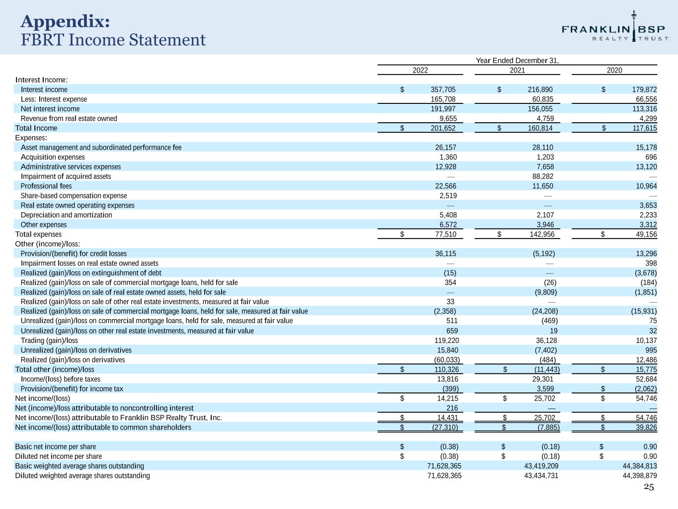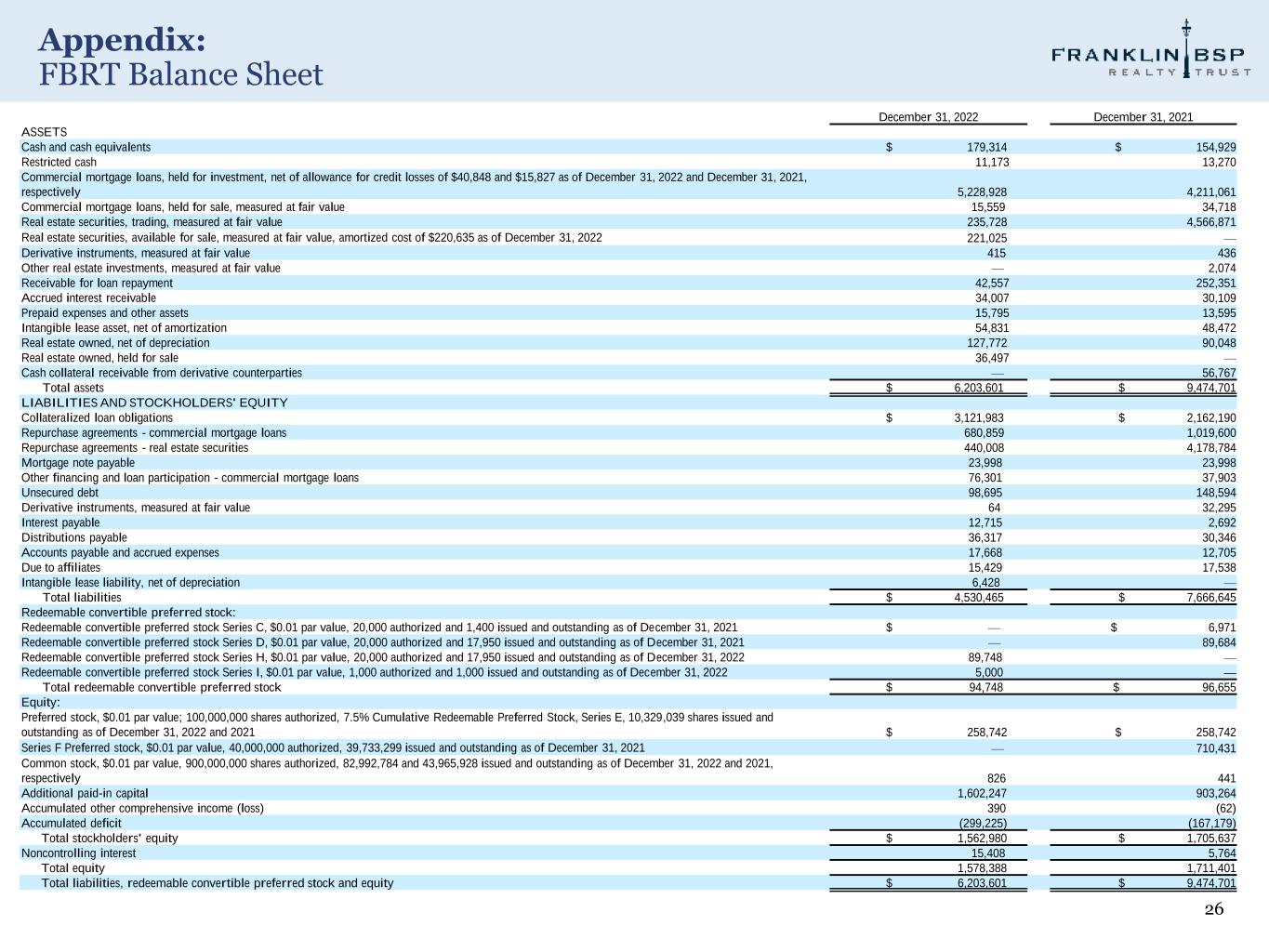 25 Appendix: FBRT Income Statement Year Ended December 31, 2022 2021 2020 Interest Income: Interest income $ 357,705 $ 216,890 $ 179,872 Less: Interest expense 165,708 60,835 66,556 Net interest income 191,997 156,055 113,316 Revenue from real estate owned 9,655 4,759 4,299 Total Income $ 201,652 $ 160,814 $ 117,615 Expenses: Asset management and subordinated performance fee 26,157 28,110 15,178 Acquisition expenses 1,360 1,203 696 Administrative services expenses 12,928 7,658 13,120 Impairment of acquired assets — 88,282 — Professional fees 22,566 11,650 10,964 Share-based compensation expense 2,519 — — Real estate owned operating expenses — — 3,653 Depreciation and amortization 5,408 2,107 2,233 Other expenses 6,572 3,946 3,312 Total expenses $ 77,510 $ 142,956 $ 49,156 Other (income)/loss: Provision/(benefit) for credit losses 36,115 (5,192) 13,296 Impairment losses on real estate owned assets — — 398 Realized (gain)/loss on extinguishment of debt (15) — (3,678) Realized (gain)/loss on sale of commercial mortgage loans, held for sale 354 (26) (184) Realized (gain)/loss on sale of real estate owned assets, held for sale — (9,809) (1,851) Realized (gain)/loss on sale of other real estate investments, measured at fair value 33 — — Realized (gain)/loss on sale of commercial mortgage loans, held for sale, measured at fair value (2,358) (24,208) (15,931) Unrealized (gain)/loss on commercial mortgage loans, held for sale, measured at fair value 511 (469) 75 Unrealized (gain)/loss on other real estate investments, measured at fair value 659 19 32 Trading (gain)/loss 119,220 36,128 10,137 Unrealized (gain)/loss on derivatives 15,840 (7,402) 995 Realized (gain)/loss on derivatives (60,033) (484) 12,486 Total other (income)/loss $ 110,326 $ (11,443) $ 15,775 Income/(loss) before taxes 13,816 29,301 52,684 Provision/(benefit) for income tax (399) 3,599 $ (2,062) Net income/(loss) $ 14,215 $ 25,702 $ 54,746 Net (income)/loss attributable to noncontrolling interest 216 — — Net income/(loss) attributable to Franklin BSP Realty Trust, Inc. $ 14,431 $ 25,702 $ 54,746 Net income/(loss) attributable to common shareholders $ (27,310) $ (7,885) $ 39,826 Basic net income per share $ (0.38) $ (0.18) $ 0.90 Diluted net income per share $ (0.38) $ (0.18) $ 0.90 Basic weighted average shares outstanding 71,628,365 43,419,209 44,384,813 Diluted weighted average shares outstanding 71,628,365 43,434,731 44,398,879