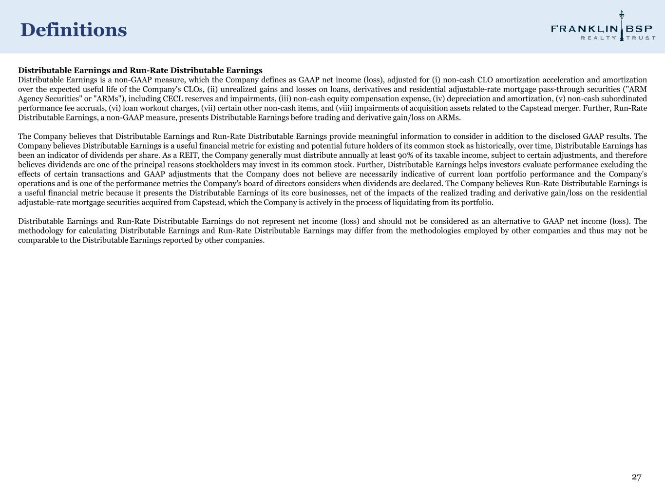 27 Definitions Distributable Earnings and Run-Rate Distributable Earnings Distributable Earnings is a non-GAAP measure, which the Company defines as GAAP net income (loss), adjusted for (i) non-cash CLO amortization acceleration and amortization over the expected useful life of the Company's CLOs, (ii) unrealized gains and losses on loans, derivatives and residential adjustable-rate mortgage pass-through securities ("ARM Agency Securities" or "ARMs"), including CECL reserves and impairments, (iii) non-cash equity compensation expense, (iv) depreciation and amortization, (v) non-cash subordinated performance fee accruals, (vi) loan workout charges, (vii) certain other non-cash items, and (viii) impairments of acquisition assets related to the Capstead merger. Further, Run-Rate Distributable Earnings, a non-GAAP measure, presents Distributable Earnings before trading and derivative gain/loss on ARMs. The Company believes that Distributable Earnings and Run-Rate Distributable Earnings provide meaningful information to consider in addition to the disclosed GAAP results. The Company believes Distributable Earnings is a useful financial metric for existing and potential future holders of its common stock as historically, over time, Distributable Earnings has been an indicator of dividends per share. As a REIT, the Company generally must distribute annually at least 90% of its taxable income, subject to certain adjustments, and therefore believes dividends are one of the principal reasons stockholders may invest in its common stock. Further, Distributable Earnings helps investors evaluate performance excluding the effects of certain transactions and GAAP adjustments that the Company does not believe are necessarily indicative of current loan portfolio performance and the Company's operations and is one of the performance metrics the Company's board of directors considers when dividends are declared. The Company believes Run-Rate Distributable Earnings is a useful financial metric because it presents the Distributable Earnings of its core businesses, net of the impacts of the realized trading and derivative gain/loss on the residential adjustable-rate mortgage securities acquired from Capstead, which the Company is actively in the process of liquidating from its portfolio. Distributable Earnings and Run-Rate Distributable Earnings do not represent net income (loss) and should not be considered as an alternative to GAAP net income (loss). The methodology for calculating Distributable Earnings and Run-Rate Distributable Earnings may differ from the methodologies employed by other companies and thus may not be comparable to the Distributable Earnings reported by other companies.