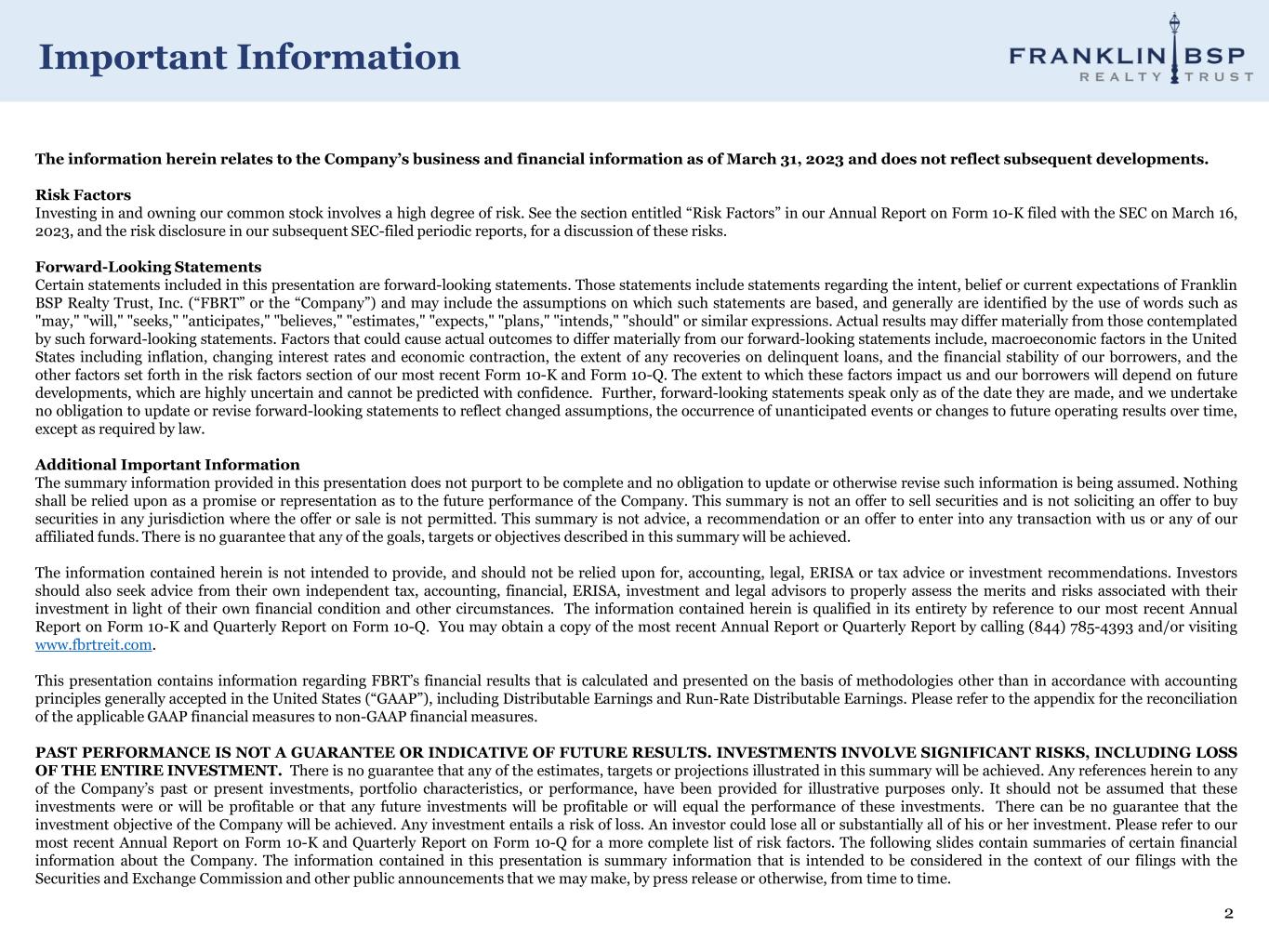 Important Information 2 The information herein relates to the Company’s business and financial information as of March 31, 2023 and does not reflect subsequent developments. Risk Factors Investing in and owning our common stock involves a high degree of risk. See the section entitled “Risk Factors” in our Annual Report on Form 10-K filed with the SEC on March 16, 2023, and the risk disclosure in our subsequent SEC-filed periodic reports, for a discussion of these risks. Forward-Looking Statements Certain statements included in this presentation are forward-looking statements. Those statements include statements regarding the intent, belief or current expectations of Franklin BSP Realty Trust, Inc. (“FBRT” or the “Company”) and may include the assumptions on which such statements are based, and generally are identified by the use of words such as "may," "will," "seeks," "anticipates," "believes," "estimates," "expects," "plans," "intends," "should" or similar expressions. Actual results may differ materially from those contemplated by such forward-looking statements. Factors that could cause actual outcomes to differ materially from our forward-looking statements include, macroeconomic factors in the United States including inflation, changing interest rates and economic contraction, the extent of any recoveries on delinquent loans, and the financial stability of our borrowers, and the other factors set forth in the risk factors section of our most recent Form 10-K and Form 10-Q. The extent to which these factors impact us and our borrowers will depend on future developments, which are highly uncertain and cannot be predicted with confidence. Further, forward-looking statements speak only as of the date they are made, and we undertake no obligation to update or revise forward-looking statements to reflect changed assumptions, the occurrence of unanticipated events or changes to future operating results over time, except as required by law. Additional Important Information The summary information provided in this presentation does not purport to be complete and no obligation to update or otherwise revise such information is being assumed. Nothing shall be relied upon as a promise or representation as to the future performance of the Company. This summary is not an offer to sell securities and is not soliciting an offer to buy securities in any jurisdiction where the offer or sale is not permitted. This summary is not advice, a recommendation or an offer to enter into any transaction with us or any of our affiliated funds. There is no guarantee that any of the goals, targets or objectives described in this summary will be achieved. The information contained herein is not intended to provide, and should not be relied upon for, accounting, legal, ERISA or tax advice or investment recommendations. Investors should also seek advice from their own independent tax, accounting, financial, ERISA, investment and legal advisors to properly assess the merits and risks associated with their investment in light of their own financial condition and other circumstances. The information contained herein is qualified in its entirety by reference to our most recent Annual Report on Form 10-K and Quarterly Report on Form 10-Q. You may obtain a copy of the most recent Annual Report or Quarterly Report by calling (844) 785-4393 and/or visiting www.fbrtreit.com. This presentation contains information regarding FBRT’s financial results that is calculated and presented on the basis of methodologies other than in accordance with accounting principles generally accepted in the United States (“GAAP”), including Distributable Earnings and Run-Rate Distributable Earnings. Please refer to the appendix for the reconciliation of the applicable GAAP financial measures to non-GAAP financial measures. PAST PERFORMANCE IS NOT A GUARANTEE OR INDICATIVE OF FUTURE RESULTS. INVESTMENTS INVOLVE SIGNIFICANT RISKS, INCLUDING LOSS OF THE ENTIRE INVESTMENT. There is no guarantee that any of the estimates, targets or projections illustrated in this summary will be achieved. Any references herein to any of the Company’s past or present investments, portfolio characteristics, or performance, have been provided for illustrative purposes only. It should not be assumed that these investments were or will be profitable or that any future investments will be profitable or will equal the performance of these investments. There can be no guarantee that the investment objective of the Company will be achieved. Any investment entails a risk of loss. An investor could lose all or substantially all of his or her investment. Please refer to our most recent Annual Report on Form 10-K and Quarterly Report on Form 10-Q for a more complete list of risk factors. The following slides contain summaries of certain financial information about the Company. The information contained in this presentation is summary information that is intended to be considered in the context of our filings with the Securities and Exchange Commission and other public announcements that we may make, by press release or otherwise, from time to time.