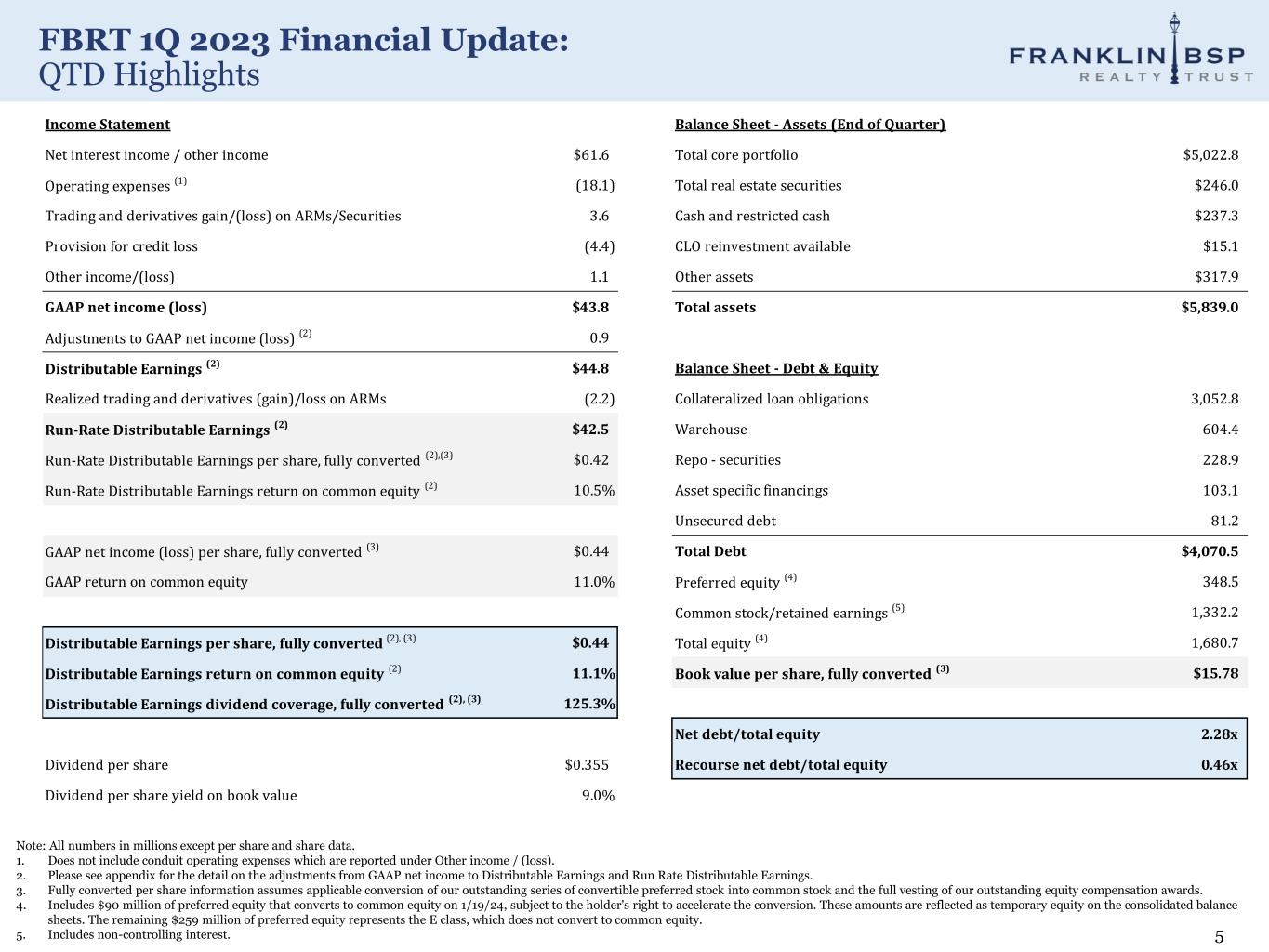 FBRT 1Q 2023 Financial Update: First Quarter 2023 Highlights 4 1. Fully converted per share information assumes applicable conversion of our outstanding series of convertible preferred stock into common stock and the full vesting of our outstanding equity compensation awards. 2. Please see appendix for GAAP net income to Distributable Earnings and Run-Rate Distributable Earnings calculation. 3. Adjusted for accumulated depreciation and amortization of real property of $5.2 million. 4. Cash excludes restricted cash. Total liquidity amount includes the cash available we can invest at a market advance rate utilizing our available capacity on financing lines. 5. Including new commitments on existing loans, total new commitments in the quarter was 5 loans for $203 million. Earnings ― GAAP Net Income of $43.8 million and $0.44 per diluted common share and $0.44 per fully converted share (1) ― Distributable Earnings (2) of $44.8 million and $0.44 per fully converted share (1) ― Declared a cash dividend of $0.355 per share, representing a yield of 9.0% on book value per share, fully converted (1). GAAP and Distributable Earnings (2) dividend coverage of 124% and 125%, respectively Capitalization ― Book value per share, fully converted is $15.78 vs. $15.78 last quarter (1). Undepreciated book value per share, fully converted is $15.86 (1), (3) ― Net debt to equity is 2.3x; recourse net debt to equity is 0.5x ― 79% of financing sources are non-mark-to-market on our core book ― $1.0 billion of liquidity of which $230 million is cash and $15 million is CLO reinvest available (4) ― FBRT repurchased 313 thousand shares for $3.7 million. $44.8 million remains available under the company’s repurchase program ― FBRT repurchased $17.5 million notional of its unsecured debt at a purchase price of 75% Investments ― Core portfolio: closed $200 million of commitments on new investments (5) and funded $193 million of principal balance including future funding on existing loans. Received loan repayments of $381 million for a net reduction in our loan portfolio of $188 million in the quarter (5) Portfolio ― Core portfolio of 157 CRE loans and $5.1 billion of principal balance, average size of $32 million and 76% multifamily. During the quarter, two assets were removed from the watch list. Three assets remain on the watch list at quarter-end ― Post quarter-end, two assets were removed from the watch list and one asset remains on the watch list