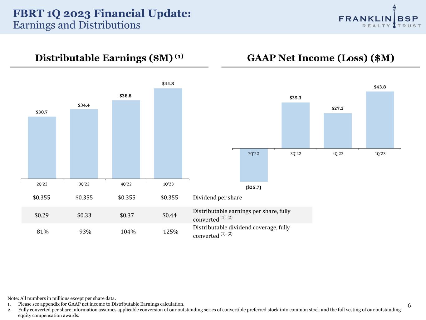 FBRT 1Q 2023 Financial Update: QTD Highlights 5 Note: All numbers in millions except per share and share data. 1. Does not include conduit operating expenses which are reported under Other income / (loss). 2. Please see appendix for the detail on the adjustments from GAAP net income to Distributable Earnings and Run Rate Distributable Earnings. 3. Fully converted per share information assumes applicable conversion of our outstanding series of convertible preferred stock into common stock and the full vesting of our outstanding equity compensation awards. 4. Includes $90 million of preferred equity that converts to common equity on 1/19/24, subject to the holder's right to accelerate the conversion. These amounts are reflected as temporary equity on the consolidated balance sheets. The remaining $259 million of preferred equity represents the E class, which does not convert to common equity. 5. Includes non-controlling interest. Income Statement Balance Sheet - Assets (End of Quarter) Net interest income / other income $61.6 Total core portfolio $5,022.8 Operating expenses (1) (18.1) Total real estate securities $246.0 Trading and derivatives gain/(loss) on ARMs/Securities 3.6 Cash and restricted cash $237.3 Provision for credit loss (4.4) CLO reinvestment available $15.1 Other income/(loss) 1.1 Other assets $317.9 GAAP net income (loss) $43.8 Total assets $5,839.0 Adjustments to GAAP net income (loss) (2) 0.9 Distributable Earnings (2) $44.8 Balance Sheet - Debt & Equity Realized trading and derivatives (gain)/loss on ARMs (2.2) Collateralized loan obligations 3,052.8 Run-Rate Distributable Earnings (2) $42.5 Warehouse 604.4 Run-Rate Distributable Earnings per share, fully converted (2),(3) $0.42 Repo - securities 228.9 Run-Rate Distributable Earnings return on common equity (2) 10.5% Asset specific financings 103.1 Unsecured debt 81.2 GAAP net income (loss) per share, fully converted (3) $0.44 Total Debt $4,070.5 GAAP return on common equity 11.0% Preferred equity (4) 348.5 Common stock/retained earnings (5) 1,332.2 Distributable Earnings per share, fully converted (2), (3) $0.44 Total equity (4) 1,680.7 Distributable Earnings return on common equity (2) 11.1% Book value per share, fully converted (3) $15.78 Distributable Earnings dividend coverage, fully converted (2), (3) 125.3% Net debt/total equity 2.28x Dividend per share $0.355 Recourse net debt/total equity 0.46x Dividend per share yield on book value 9.0%