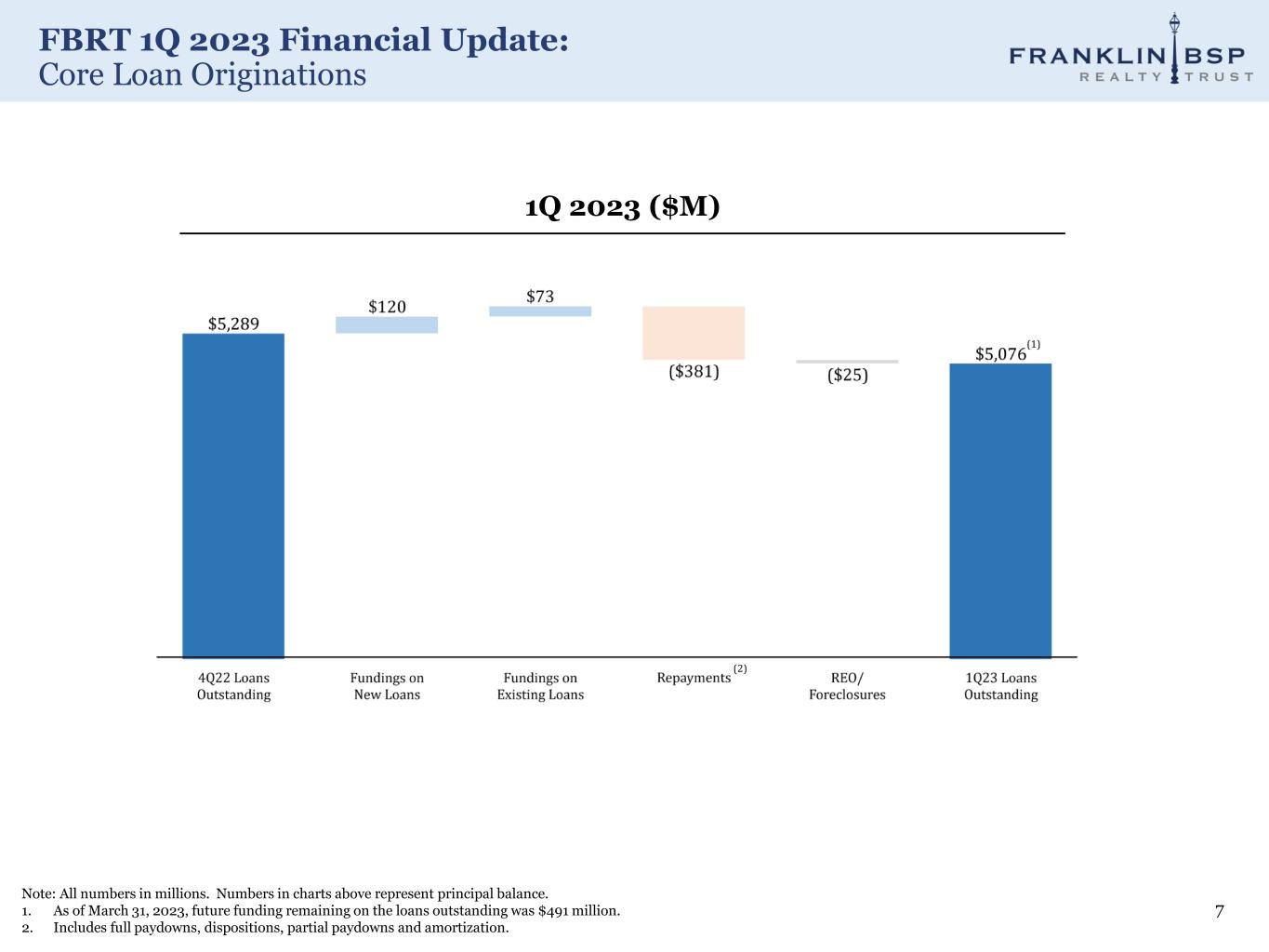 FBRT 1Q 2023 Financial Update: Earnings and Distributions 6 Note: All numbers in millions except per share data. 1. Please see appendix for GAAP net income to Distributable Earnings calculation. 2. Fully converted per share information assumes applicable conversion of our outstanding series of convertible preferred stock into common stock and the full vesting of our outstanding equity compensation awards. GAAP Net Income (Loss) ($M)Distributable Earnings ($M) (1) ($25.7) $35.3 $27.2 $43.8 2Q'22 3Q'22 4Q'22 1Q'23 $30.7 $34.4 $38.8 $44.8 2Q'22 3Q'22 4Q'22 1Q'23 $0.355 $0.355 $0.355 $0.355 Dividend per share $0.29 $0.33 $0.37 $0.44 Distributable earnings per share, fully converted (1), (2) 81% 93% 104% 125% Distributable dividend coverage, fully converted (1), (2)