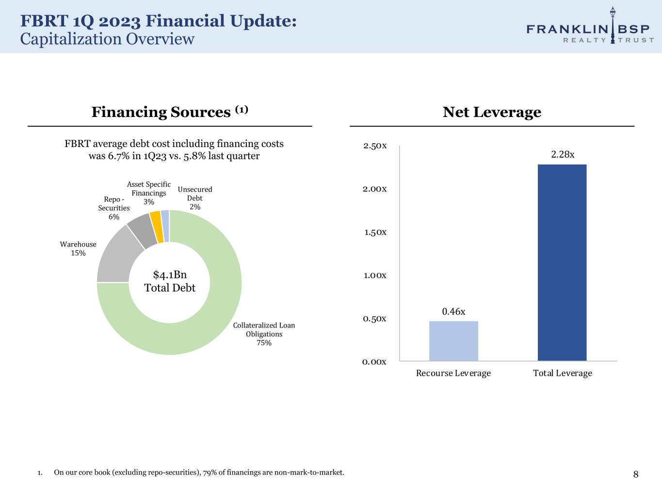 FBRT 1Q 2023 Financial Update: Core Loan Originations 7 Note: All numbers in millions. Numbers in charts above represent principal balance. 1. As of March 31, 2023, future funding remaining on the loans outstanding was $491 million. 2. Includes full paydowns, dispositions, partial paydowns and amortization. 1Q 2023 ($M) (2) (1)