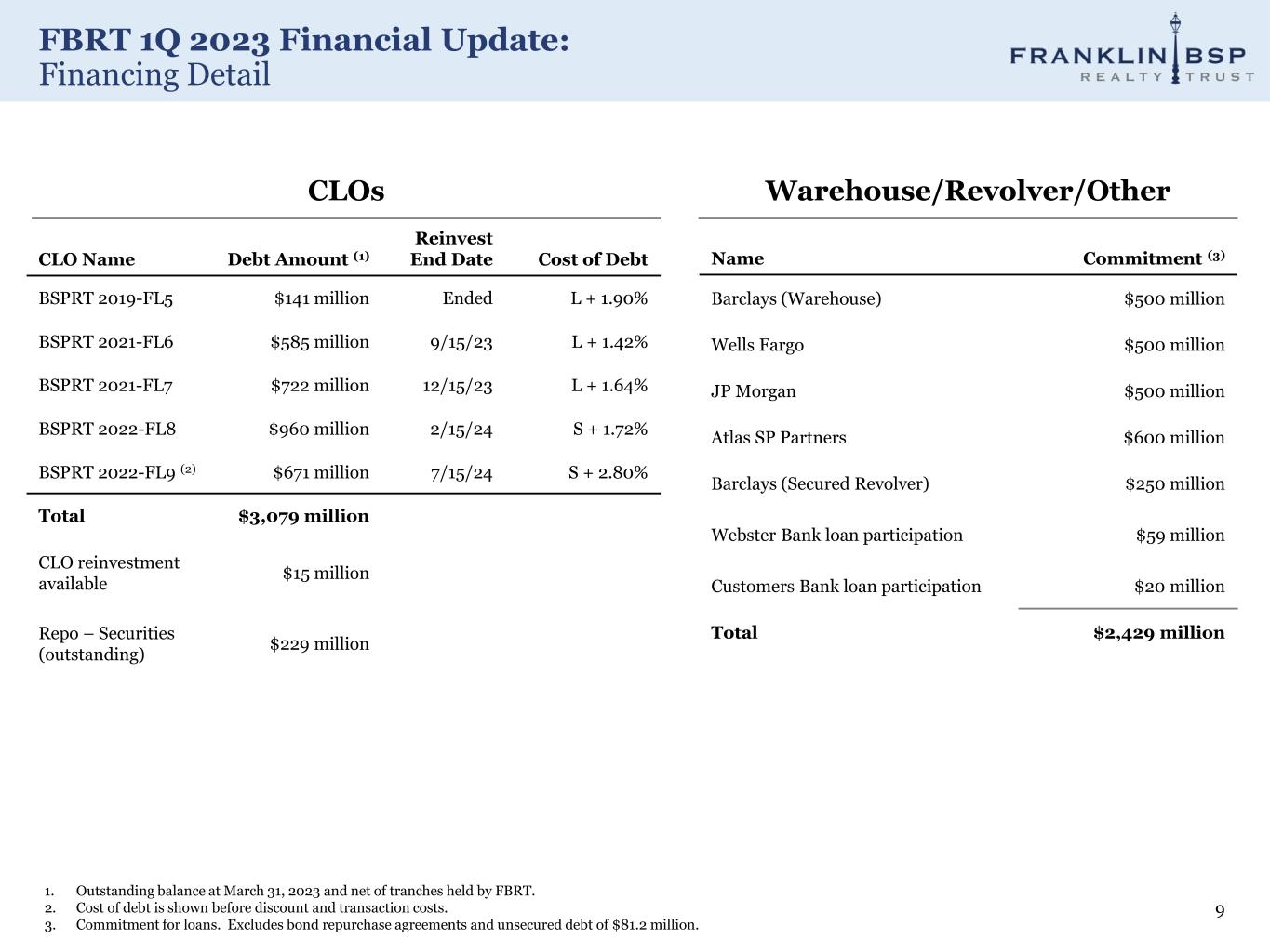 FBRT 1Q 2023 Financial Update: Capitalization Overview 1. On our core book (excluding repo-securities), 79% of financings are non-mark-to-market. 8 Collateralized Loan Obligations 75% Warehouse 15% Repo - Securities 6% Asset Specific Financings 3% Unsecured Debt 2% Financing Sources (1) FBRT average debt cost including financing costs was 6.7% in 1Q23 vs. 5.8% last quarter Net Leverage $4.1Bn Total Debt 0.46x 2.28x 0.00x 0.50x 1.00x 1.50x 2.00x 2.50x Recourse Leverage Total Leverage