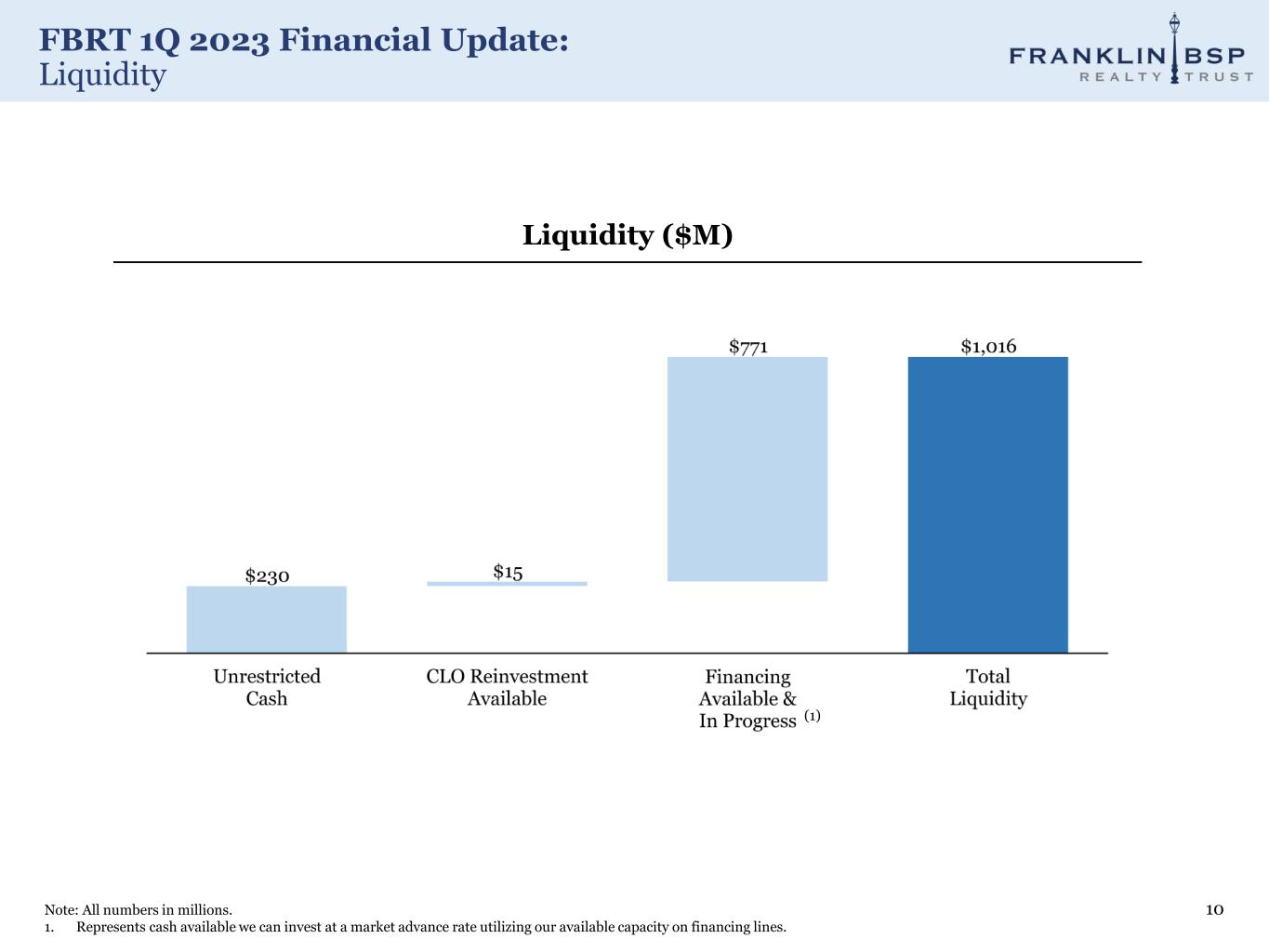 FBRT 1Q 2023 Financial Update: Financing Detail 9 1. Outstanding balance at March 31, 2023 and net of tranches held by FBRT. 2. Cost of debt is shown before discount and transaction costs. 3. Commitment for loans. Excludes bond repurchase agreements and unsecured debt of $81.2 million. CLO Name Debt Amount (1) Reinvest End Date Cost of Debt BSPRT 2019-FL5 $141 million Ended L + 1.90% BSPRT 2021-FL6 $585 million 9/15/23 L + 1.42% BSPRT 2021-FL7 $722 million 12/15/23 L + 1.64% BSPRT 2022-FL8 $960 million 2/15/24 S + 1.72% BSPRT 2022-FL9 (2) $671 million 7/15/24 S + 2.80% Total $3,079 million CLO reinvestment available $15 million Repo – Securities (outstanding) $229 million Name Commitment (3) Barclays (Warehouse) $500 million Wells Fargo $500 million JP Morgan $500 million Atlas SP Partners $600 million Barclays (Secured Revolver) $250 million Webster Bank loan participation $59 million Customers Bank loan participation $20 million Total $2,429 million CLOs Warehouse/Revolver/Other