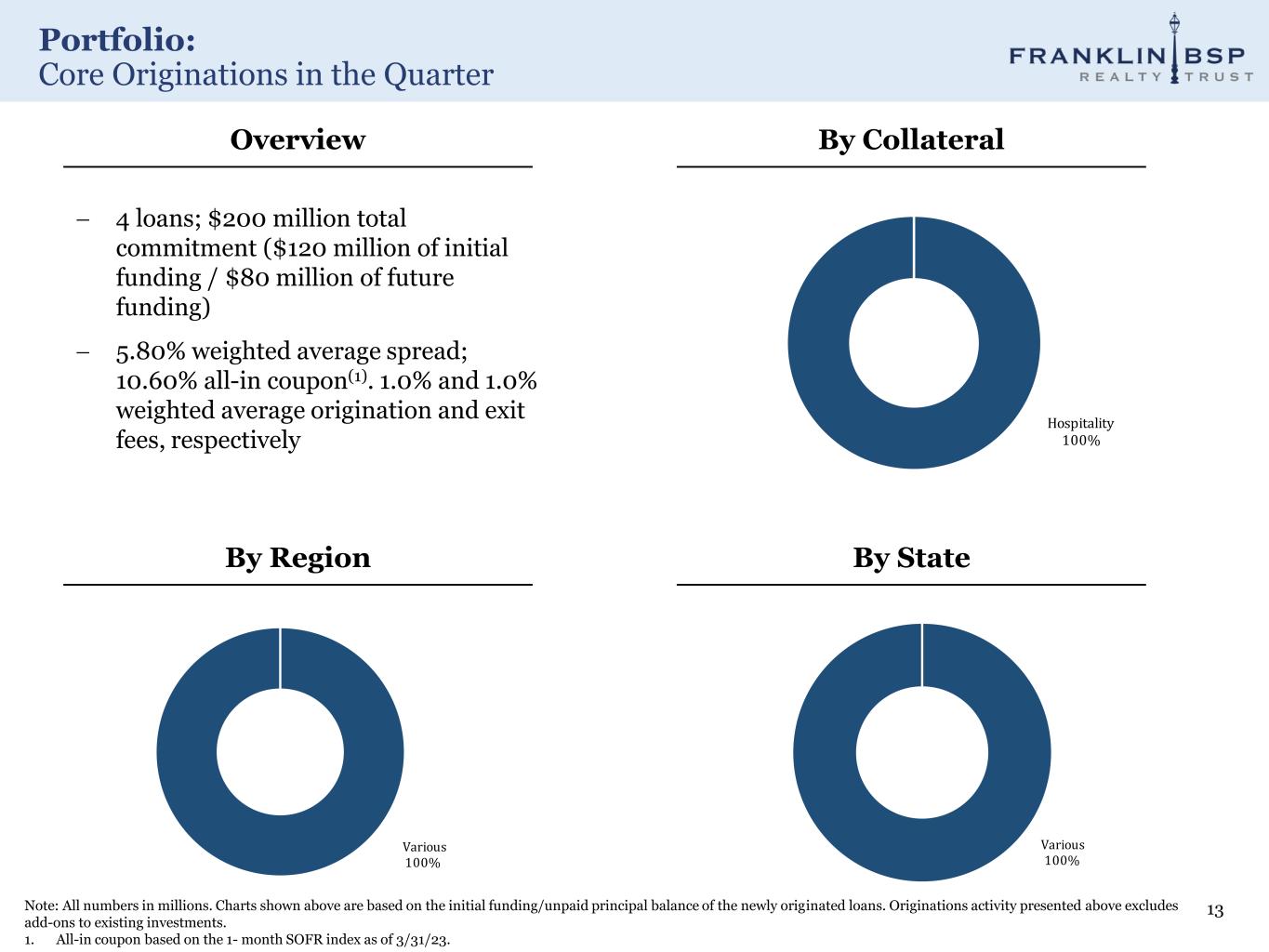Portfolio: Core Loan Portfolio Composition 12 1. Regions included: New England, Plains, Rocky Mountain. Mezzanine 0.5% Senior 99.5% Southeast 40% Southwest 34% Mideast 10% Far West 4% Great Lakes 3% Various(1) 9% Floating 98% Fixed 2% Portfolio Summary Collateral Summary Collateral by Region Rate Type Portfolio Overview − $5.1 billion total portfolio − 150 senior loans; average size of ~$34 million − 7 mezzanine loans; average size of ~$3 million − Two non-performing loans Multifamily 76% Office 6% Hospitality 12%Retail 2% Industrial 2% Other 2%