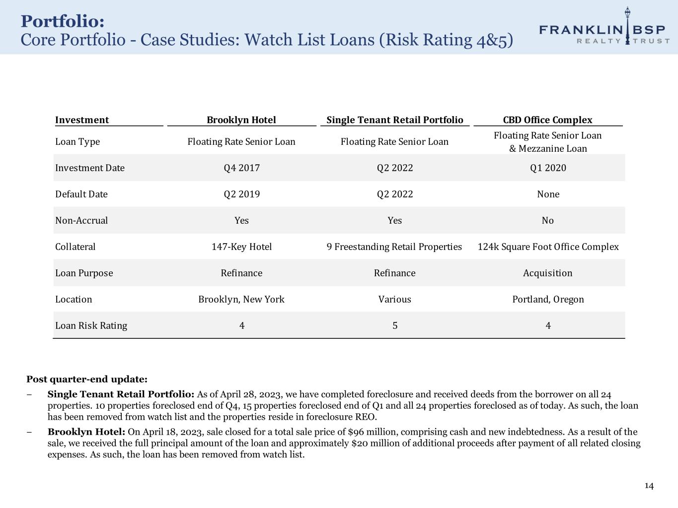 Portfolio: Core Originations in the Quarter 13Note: All numbers in millions. Charts shown above are based on the initial funding/unpaid principal balance of the newly originated loans. Originations activity presented above excludes add-ons to existing investments. 1. All-in coupon based on the 1- month SOFR index as of 3/31/23. − 4 loans; $200 million total commitment ($120 million of initial funding / $80 million of future funding) − 5.80% weighted average spread; 10.60% all-in coupon(1). 1.0% and 1.0% weighted average origination and exit fees, respectively By Collateral By Region By State Overview Various 100% Hospitality 100% Various 100%