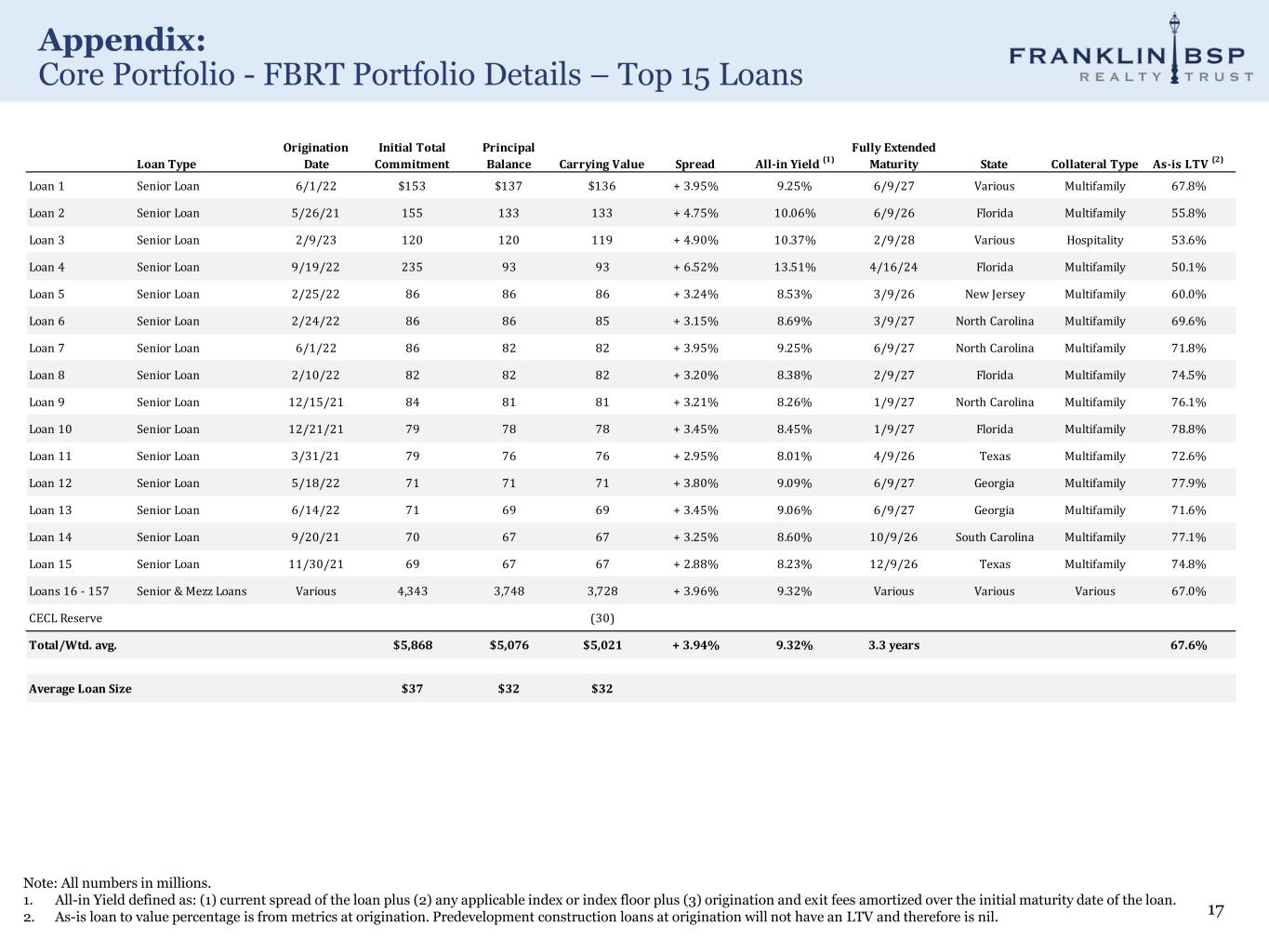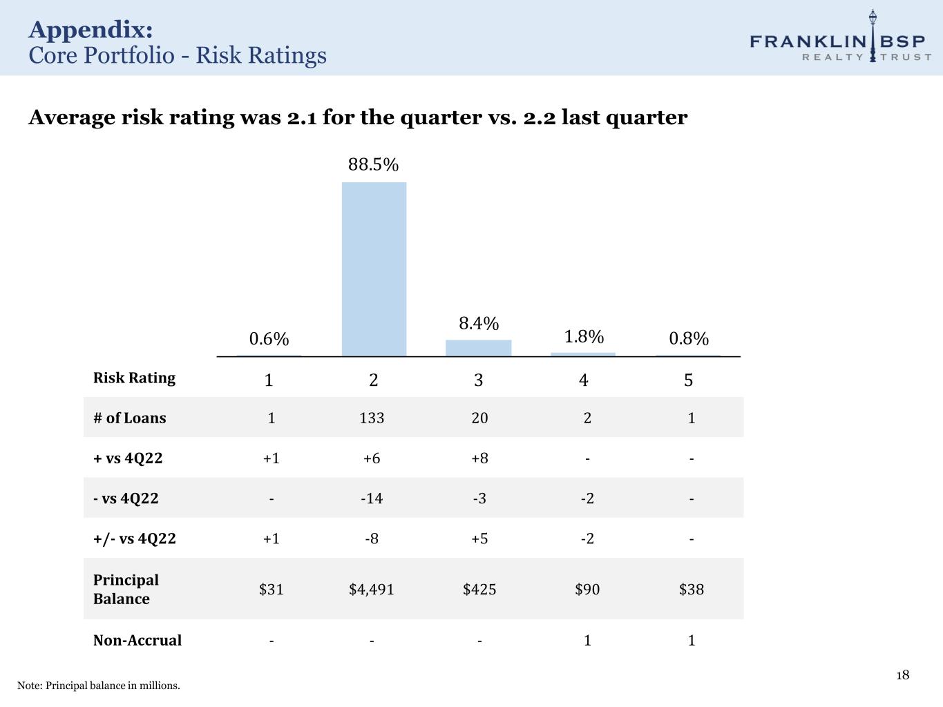 Appendix: Core Portfolio - FBRT Portfolio Details – Top 15 Loans 17 Note: All numbers in millions. 1. All-in Yield defined as: (1) current spread of the loan plus (2) any applicable index or index floor plus (3) origination and exit fees amortized over the initial maturity date of the loan. 2. As-is loan to value percentage is from metrics at origination. Predevelopment construction loans at origination will not have an LTV and therefore is nil. Loan Type Origination Date Initial Total Commitment Principal Balance Carrying Value Spread All-in Yield (1) Fully Extended Maturity State Collateral Type As-is LTV (2) Loan 1 Senior Loan 6/1/22 $153 $137 $136 + 3.95% 9.25% 6/9/27 Various Multifamily 67.8% Loan 2 Senior Loan 5/26/21 155 133 133 + 4.75% 10.06% 6/9/26 Florida Multifamily 55.8% Loan 3 Senior Loan 2/9/23 120 120 119 + 4.90% 10.37% 2/9/28 Various Hospitality 53.6% Loan 4 Senior Loan 9/19/22 235 93 93 + 6.52% 13.51% 4/16/24 Florida Multifamily 50.1% Loan 5 Senior Loan 2/25/22 86 86 86 + 3.24% 8.53% 3/9/26 New Jersey Multifamily 60.0% Loan 6 Senior Loan 2/24/22 86 86 85 + 3.15% 8.69% 3/9/27 North Carolina Multifamily 69.6% Loan 7 Senior Loan 6/1/22 86 82 82 + 3.95% 9.25% 6/9/27 North Carolina Multifamily 71.8% Loan 8 Senior Loan 2/10/22 82 82 82 + 3.20% 8.38% 2/9/27 Florida Multifamily 74.5% Loan 9 Senior Loan 12/15/21 84 81 81 + 3.21% 8.26% 1/9/27 North Carolina Multifamily 76.1% Loan 10 Senior Loan 12/21/21 79 78 78 + 3.45% 8.45% 1/9/27 Florida Multifamily 78.8% Loan 11 Senior Loan 3/31/21 79 76 76 + 2.95% 8.01% 4/9/26 Texas Multifamily 72.6% Loan 12 Senior Loan 5/18/22 71 71 71 + 3.80% 9.09% 6/9/27 Georgia Multifamily 77.9% Loan 13 Senior Loan 6/14/22 71 69 69 + 3.45% 9.06% 6/9/27 Georgia Multifamily 71.6% Loan 14 Senior Loan 9/20/21 70 67 67 + 3.25% 8.60% 10/9/26 South Carolina Multifamily 77.1% Loan 15 Senior Loan 11/30/21 69 67 67 + 2.88% 8.23% 12/9/26 Texas Multifamily 74.8% Loans 16 - 157 Senior & Mezz Loans Various 4,343 3,748 3,728 + 3.96% 9.32% Various Various Various 67.0% CECL Reserve (30) Total/Wtd. avg. $5,868 $5,076 $5,021 + 3.94% 9.32% 3.3 years 67.6% Average Loan Size $37 $32 $32