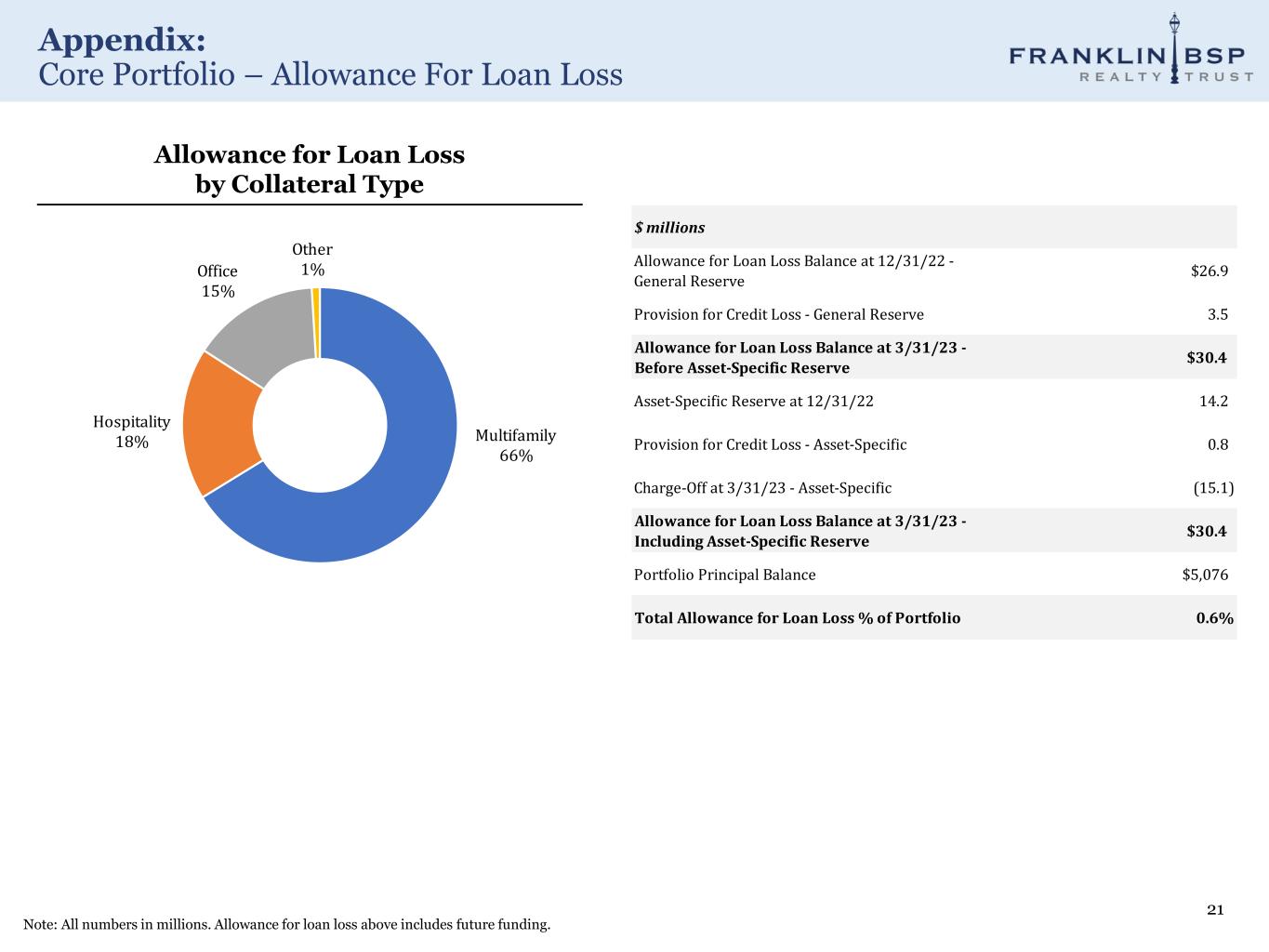 Appendix: Core Portfolio – Allowance For Loan Loss 21 Note: All numbers in millions. Allowance for loan loss above includes future funding. Allowance for Loan Loss by Collateral Type $ millions Allowance for Loan Loss Balance at 12/31/22 - General Reserve $26.9 Provision for Credit Loss - General Reserve 3.5 Allowance for Loan Loss Balance at 3/31/23 - Before Asset-Specific Reserve $30.4 Asset-Specific Reserve at 12/31/22 14.2 Provision for Credit Loss - Asset-Specific 0.8 Charge-Off at 3/31/23 - Asset-Specific (15.1) Allowance for Loan Loss Balance at 3/31/23 - Including Asset-Specific Reserve $30.4 Portfolio Principal Balance $5,076 Total Allowance for Loan Loss % of Portfolio 0.6% Multifamily 66% Hospitality 18% Office 15% Other 1%