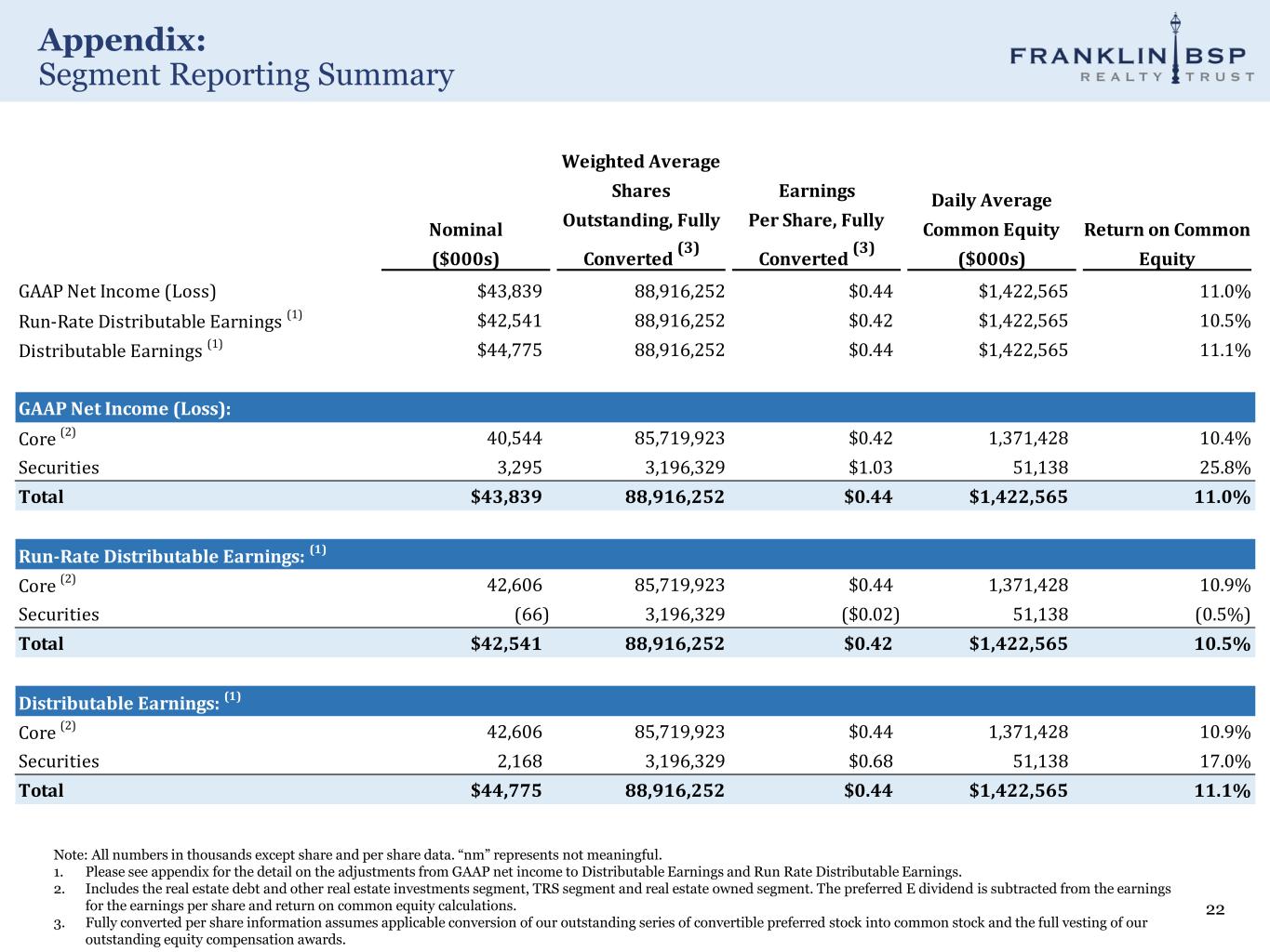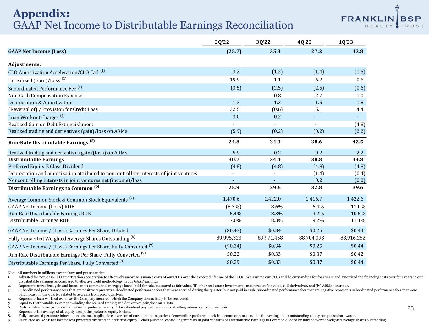 Appendix: Segment Reporting Summary 22 Note: All numbers in thousands except share and per share data. “nm” represents not meaningful. 1. Please see appendix for the detail on the adjustments from GAAP net income to Distributable Earnings and Run Rate Distributable Earnings. 2. Includes the real estate debt and other real estate investments segment, TRS segment and real estate owned segment. The preferred E dividend is subtracted from the earnings for the earnings per share and return on common equity calculations. 3. Fully converted per share information assumes applicable conversion of our outstanding series of convertible preferred stock into common stock and the full vesting of our outstanding equity compensation awards. Nominal ($000s) Weighted Average Shares Outstanding, Fully Converted (3) Earnings Per Share, Fully Converted (3) Daily Average Common Equity ($000s) Return on Common Equity GAAP Net Income (Loss) $43,839 88,916,252 $0.44 $1,422,565 11.0% Run-Rate Distributable Earnings (1) $42,541 88,916,252 $0.42 $1,422,565 10.5% Distributable Earnings (1) $44,775 88,916,252 $0.44 $1,422,565 11.1% GAAP Net Income (Loss): Core (2) 40,544 85,719,923 $0.42 1,371,428 10.4% Securities 3,295 3,196,329 $1.03 51,138 25.8% Total $43,839 88,916,252 $0.44 $1,422,565 11.0% Run-Rate Distributable Earnings: (1) Core (2) 42,606 85,719,923 $0.44 1,371,428 10.9% Securities (66) 3,196,329 ($0.02) 51,138 (0.5%) Total $42,541 88,916,252 $0.42 $1,422,565 10.5% Distributable Earnings: (1) Core (2) 42,606 85,719,923 $0.44 1,371,428 10.9% Securities 2,168 3,196,329 $0.68 51,138 17.0% Total $44,775 88,916,252 $0.44 $1,422,565 11.1%