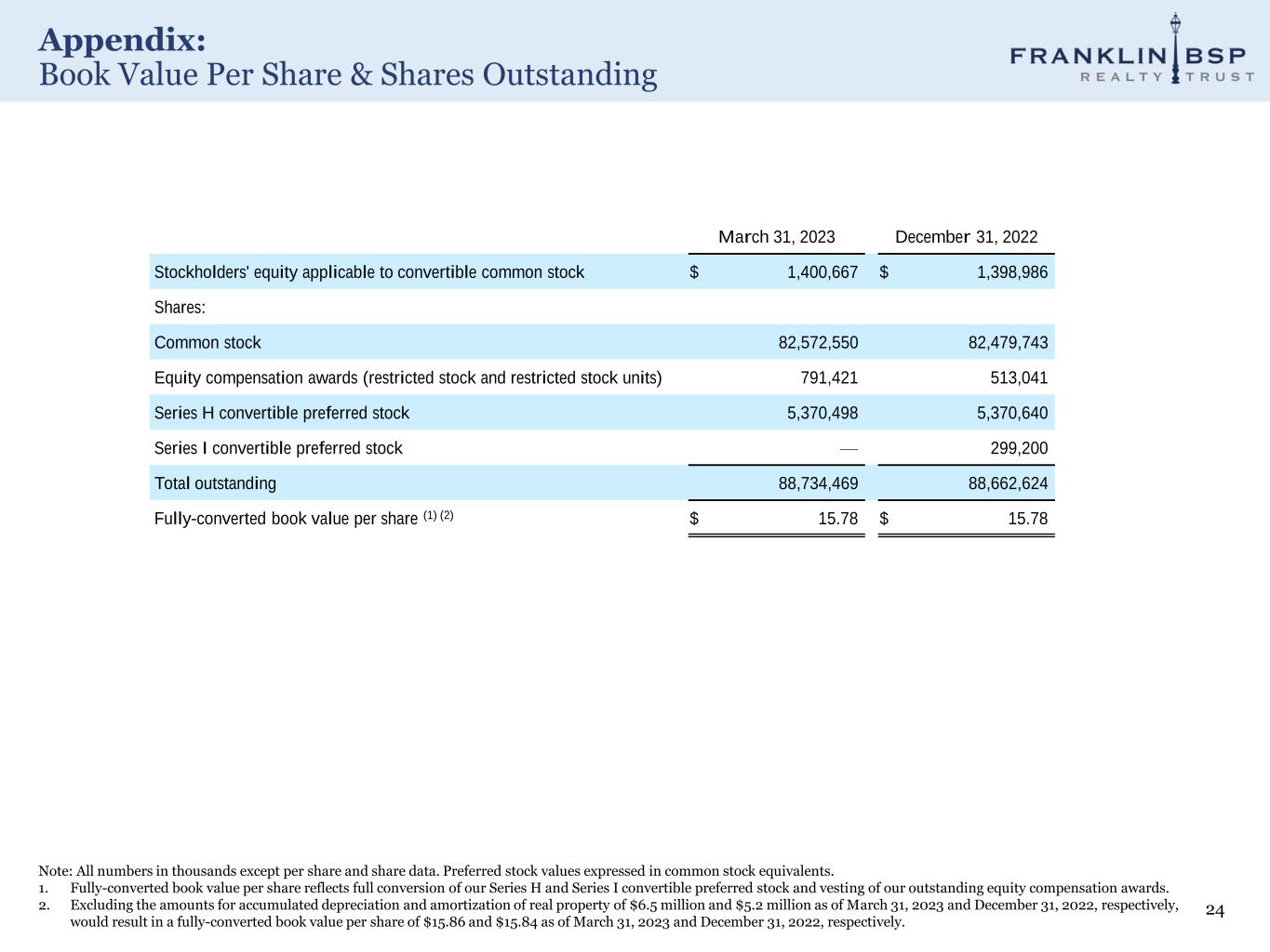 Appendix: GAAP Net Income to Distributable Earnings Reconciliation 23 Note: All numbers in millions except share and per share data. 1. Adjusted for non-cash CLO amortization acceleration to effectively amortize issuance costs of our CLOs over the expected lifetime of the CLOs. We assume our CLOs will be outstanding for four years and amortized the financing costs over four years in our distributable earnings as compared to effective yield methodology in our GAAP earnings 2. Represents unrealized gain and losses on (i) commercial mortgage loans, held for sale, measured at fair value, (ii) other real estate investments, measured at fair value, (iii) derivatives. and (iv) ARMs securities. 3. Subordinated performance fees that are positive represents subordinated performance fees that were accrued during the quarter, but not paid in cash. Subordinated performance fees that are negative represents subordinated performance fees that were paid in cash in the quarter related to accruals from prior quarters. 4. Represents loan workout expenses the Company incurred, which the Company deems likely to be recovered. 5. Equal to Distributable Earnings excluding the realized trading and derivatives gain/loss on ARMs. 6. Distributable Earnings to common is net of preferred equity E class dividend payment and noncontrolling interests in joint ventures. 7. Represents the average of all equity except the preferred equity E class. 8. Fully converted per share information assumes applicable conversion of our outstanding series of convertible preferred stock into common stock and the full vesting of our outstanding equity compensation awards. 9. Calculated as GAAP net income less preferred dividend on preferred equity E class plus non-controlling interests in joint ventures or Distributable Earnings to Common divided by fully converted weighted average shares outstanding. 2Q'22 3Q'22 4Q'22 1Q'23 GAAP Net Income (Loss) (25.7) 35.3 27.2 43.8 Adjustments: CLO Amortization Acceleration/CLO Call (1) 3.2 (1.2) (1.4) (1.5) Unrealized (Gain)/Loss (2) 19.9 1.1 6.2 0.6 Subordinated Performance Fee (3) (3.5) (2.5) (2.5) (0.6) Non-Cash Compensation Expense - 0.8 2.7 1.0 Depreciation & Amortization 1.3 1.3 1.5 1.8 (Reversal of) / Provision for Credit Loss 32.5 (0.6) 5.1 4.4 Loan Workout Charges (4) 3.0 0.2 - - Realized Gain on Debt Extinguishment - - - (4.8) Realized trading and derivatives (gain)/loss on ARMs (5.9) (0.2) (0.2) (2.2) Run-Rate Distributable Earnings (5) 24.8 34.3 38.6 42.5 Realized trading and derivatives gain/(loss) on ARMs 5.9 0.2 0.2 2.2 Distributable Earnings 30.7 34.4 38.8 44.8 Preferred Equity E Class Dividend (4.8) (4.8) (4.8) (4.8) Depreciation and amortization attributed to noncontrolling interests of joint ventures - - (1.4) (0.4) Noncontrolling interests in joint ventures net (income)/loss - - 0.2 (0.0) Distributable Earnings to Common (6) 25.9 29.6 32.8 39.6 Average Common Stock & Common Stock Equivalents (7) 1,470.6 1,422.0 1,416.7 1,422.6 GAAP Net Income (Loss) ROE (8.3%) 8.6% 6.4% 11.0% Run-Rate Distributable Earnings ROE 5.4% 8.3% 9.2% 10.5% Distributable Earnings ROE 7.0% 8.3% 9.2% 11.1% GAAP Net Income / (Loss) Earnings Per Share, Diluted ($0.43) $0.34 $0.25 $0.44 Fully Converted Weighted Average Shares Outstanding (8) 89,995,323 89,971,458 88,704,093 88,916,252 GAAP Net Income / (Loss) Earnings Per Share, Fully Converted (9) ($0.34) $0.34 $0.25 $0.44 Run-Rate Distributable Earnings Per Share, Fully Converted (9) $0.22 $0.33 $0.37 $0.42 Distributable Earnings Per Share, Fully Converted (9) $0.29 $0.33 $0.37 $0.44