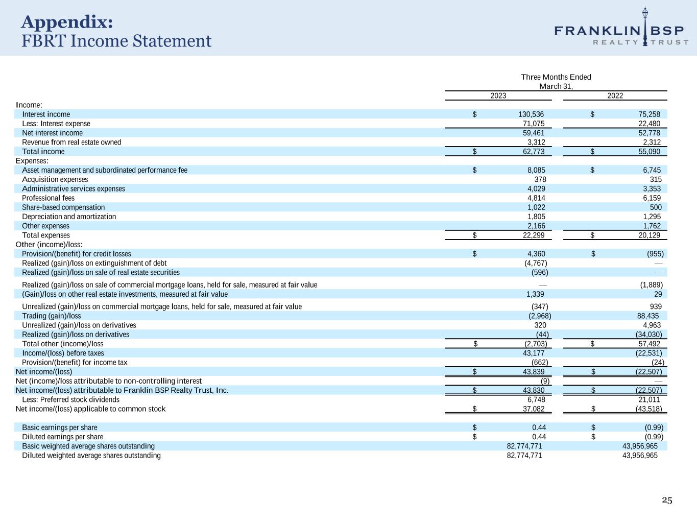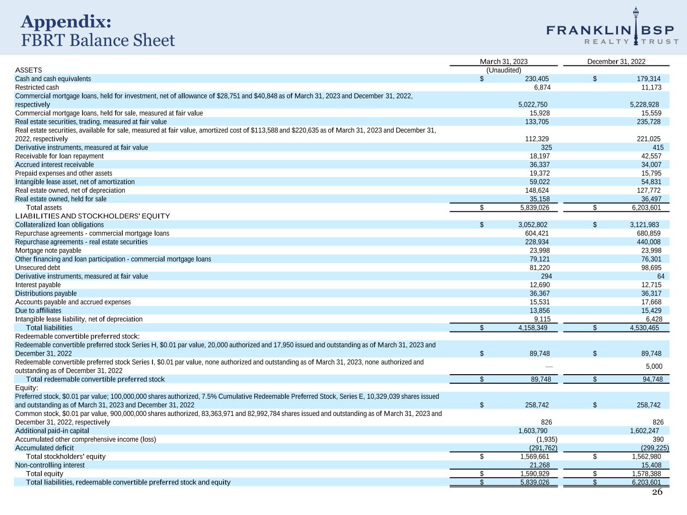25 Appendix: FBRT Income Statement Three Months Ended March 31, 2023 2022 Income: Interest income $ 130,536 $ 75,258 Less: Interest expense 71,075 22,480 Net interest income 59,461 52,778 Revenue from real estate owned 3,312 2,312 Total income $ 62,773 $ 55,090 Expenses: Asset management and subordinated performance fee $ 8,085 $ 6,745 Acquisition expenses 378 315 Administrative services expenses 4,029 3,353 Professional fees 4,814 6,159 Share-based compensation 1,022 500 Depreciation and amortization 1,805 1,295 Other expenses 2,166 1,762 Total expenses $ 22,299 $ 20,129 Other (income)/loss: Provision/(benefit) for credit losses $ 4,360 $ (955) Realized (gain)/loss on extinguishment of debt (4,767) — Realized (gain)/loss on sale of real estate securities (596) — Realized (gain)/loss on sale of commercial mortgage loans, held for sale, measured at fair value — (1,889) (Gain)/loss on other real estate investments, measured at fair value 1,339 29 Unrealized (gain)/loss on commercial mortgage loans, held for sale, measured at fair value (347) 939 Trading (gain)/loss (2,968) 88,435 Unrealized (gain)/loss on derivatives 320 4,963 Realized (gain)/loss on derivatives (44) (34,030) Total other (income)/loss $ (2,703) $ 57,492 Income/(loss) before taxes 43,177 (22,531) Provision/(benefit) for income tax (662) (24) Net income/(loss) $ 43,839 $ (22,507) Net (income)/loss attributable to non-controlling interest (9) — Net income/(loss) attributable to Franklin BSP Realty Trust, Inc. $ 43,830 $ (22,507) Less: Preferred stock dividends 6,748 21,011 Net income/(loss) applicable to common stock $ 37,082 $ (43,518) Basic earnings per share $ 0.44 $ (0.99) Diluted earnings per share $ 0.44 $ (0.99) Basic weighted average shares outstanding 82,774,771 43,956,965 Diluted weighted average shares outstanding 82,774,771 43,956,965