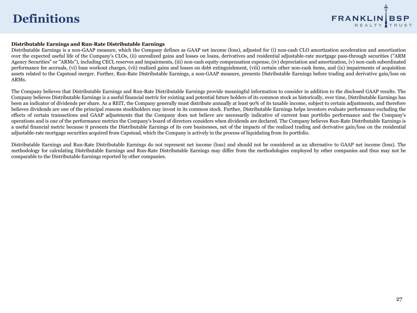 27 Definitions Distributable Earnings and Run-Rate Distributable Earnings Distributable Earnings is a non-GAAP measure, which the Company defines as GAAP net income (loss), adjusted for (i) non-cash CLO amortization acceleration and amortization over the expected useful life of the Company's CLOs, (ii) unrealized gains and losses on loans, derivatives and residential adjustable-rate mortgage pass-through securities ("ARM Agency Securities" or "ARMs"), including CECL reserves and impairments, (iii) non-cash equity compensation expense, (iv) depreciation and amortization, (v) non-cash subordinated performance fee accruals, (vi) loan workout charges, (vii) realized gains and losses on debt extinguishment, (viii) certain other non-cash items, and (ix) impairments of acquisition assets related to the Capstead merger. Further, Run-Rate Distributable Earnings, a non-GAAP measure, presents Distributable Earnings before trading and derivative gain/loss on ARMs. The Company believes that Distributable Earnings and Run-Rate Distributable Earnings provide meaningful information to consider in addition to the disclosed GAAP results. The Company believes Distributable Earnings is a useful financial metric for existing and potential future holders of its common stock as historically, over time, Distributable Earnings has been an indicator of dividends per share. As a REIT, the Company generally must distribute annually at least 90% of its taxable income, subject to certain adjustments, and therefore believes dividends are one of the principal reasons stockholders may invest in its common stock. Further, Distributable Earnings helps investors evaluate performance excluding the effects of certain transactions and GAAP adjustments that the Company does not believe are necessarily indicative of current loan portfolio performance and the Company's operations and is one of the performance metrics the Company's board of directors considers when dividends are declared. The Company believes Run-Rate Distributable Earnings is a useful financial metric because it presents the Distributable Earnings of its core businesses, net of the impacts of the realized trading and derivative gain/loss on the residential adjustable-rate mortgage securities acquired from Capstead, which the Company is actively in the process of liquidating from its portfolio. Distributable Earnings and Run-Rate Distributable Earnings do not represent net income (loss) and should not be considered as an alternative to GAAP net income (loss). The methodology for calculating Distributable Earnings and Run-Rate Distributable Earnings may differ from the methodologies employed by other companies and thus may not be comparable to the Distributable Earnings reported by other companies.