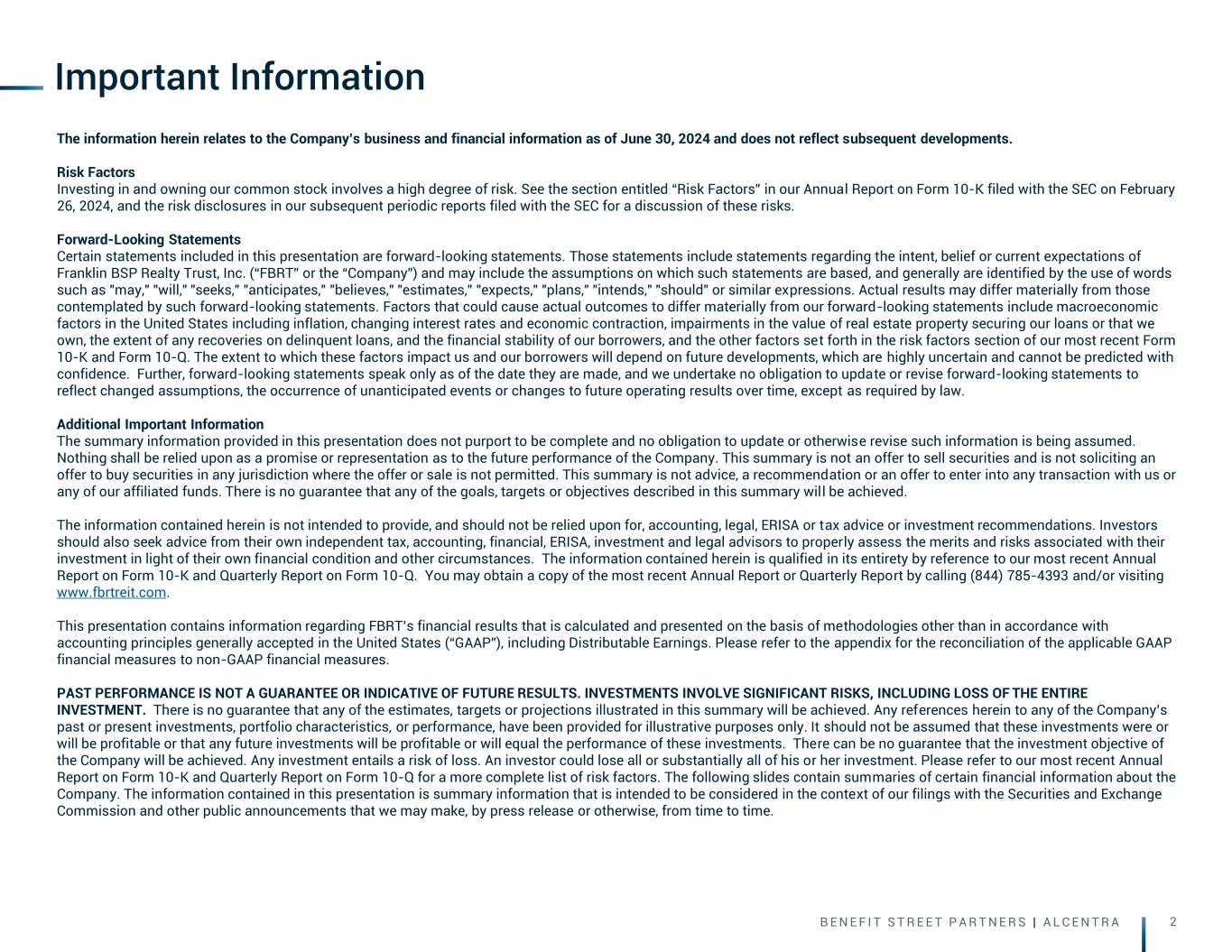 B E N E F I T S T R E E T P A R T N E R S | A L C E N T R A 2 Important Information The information herein relates to the Company’s business and financial information as of June 30, 2024 and does not reflect subsequent developments. Risk Factors Investing in and owning our common stock involves a high degree of risk. See the section entitled “Risk Factors” in our Annual Report on Form 10-K filed with the SEC on February 26, 2024, and the risk disclosures in our subsequent periodic reports filed with the SEC for a discussion of these risks. Forward-Looking Statements Certain statements included in this presentation are forward-looking statements. Those statements include statements regarding the intent, belief or current expectations of Franklin BSP Realty Trust, Inc. (“FBRT” or the “Company”) and may include the assumptions on which such statements are based, and generally are identified by the use of words such as "may," "will," "seeks," "anticipates," "believes," "estimates," "expects," "plans," "intends," "should" or similar expressions. Actual results may differ materially from those contemplated by such forward-looking statements. Factors that could cause actual outcomes to differ materially from our forward-looking statements include macroeconomic factors in the United States including inflation, changing interest rates and economic contraction, impairments in the value of real estate property securing our loans or that we own, the extent of any recoveries on delinquent loans, and the financial stability of our borrowers, and the other factors set forth in the risk factors section of our most recent Form 10-K and Form 10-Q. The extent to which these factors impact us and our borrowers will depend on future developments, which are highly uncertain and cannot be predicted with confidence. Further, forward-looking statements speak only as of the date they are made, and we undertake no obligation to update or revise forward-looking statements to reflect changed assumptions, the occurrence of unanticipated events or changes to future operating results over time, except as required by law. Additional Important Information The summary information provided in this presentation does not purport to be complete and no obligation to update or otherwise revise such information is being assumed. Nothing shall be relied upon as a promise or representation as to the future performance of the Company. This summary is not an offer to sell securities and is not soliciting an offer to buy securities in any jurisdiction where the offer or sale is not permitted. This summary is not advice, a recommendation or an offer to enter into any transaction with us or any of our affiliated funds. There is no guarantee that any of the goals, targets or objectives described in this summary will be achieved. The information contained herein is not intended to provide, and should not be relied upon for, accounting, legal, ERISA or tax advice or investment recommendations. Investors should also seek advice from their own independent tax, accounting, financial, ERISA, investment and legal advisors to properly assess the merits and risks associated with their investment in light of their own financial condition and other circumstances. The information contained herein is qualified in its entirety by reference to our most recent Annual Report on Form 10-K and Quarterly Report on Form 10-Q. You may obtain a copy of the most recent Annual Report or Quarterly Report by calling (844) 785-4393 and/or visiting www.fbrtreit.com. This presentation contains information regarding FBRT’s financial results that is calculated and presented on the basis of methodologies other than in accordance with accounting principles generally accepted in the United States (“GAAP”), including Distributable Earnings. Please refer to the appendix for the reconciliation of the applicable GAAP financial measures to non-GAAP financial measures. PAST PERFORMANCE IS NOT A GUARANTEE OR INDICATIVE OF FUTURE RESULTS. INVESTMENTS INVOLVE SIGNIFICANT RISKS, INCLUDING LOSS OF THE ENTIRE INVESTMENT. There is no guarantee that any of the estimates, targets or projections illustrated in this summary will be achieved. Any references herein to any of the Company’s past or present investments, portfolio characteristics, or performance, have been provided for illustrative purposes only. It should not be assumed that these investments were or will be profitable or that any future investments will be profitable or will equal the performance of these investments. There can be no guarantee that the investment objective of the Company will be achieved. Any investment entails a risk of loss. An investor could lose all or substantially all of his or her investment. Please refer to our most recent Annual Report on Form 10-K and Quarterly Report on Form 10-Q for a more complete list of risk factors. The following slides contain summaries of certain financial information about the Company. The information contained in this presentation is summary information that is intended to be considered in the context of our filings with the Securities and Exchange Commission and other public announcements that we may make, by press release or otherwise, from time to time.