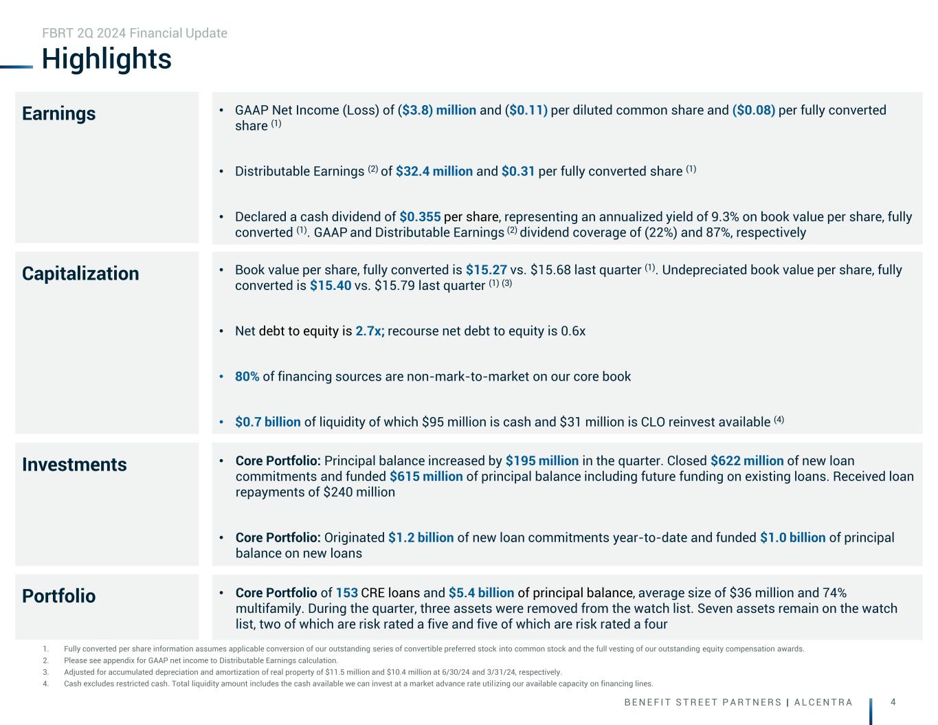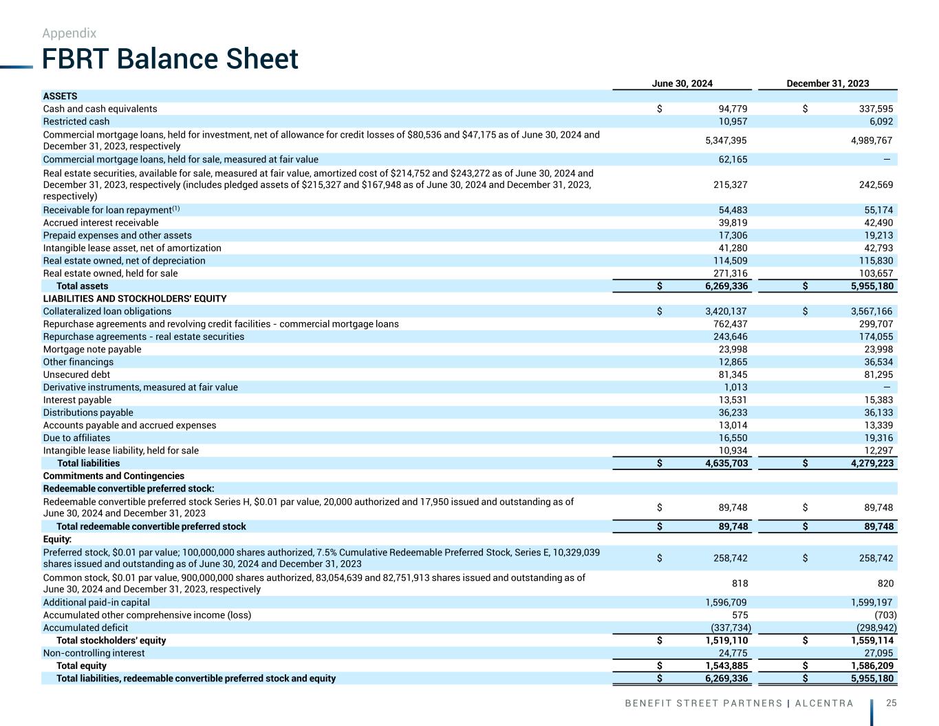 B E N E F I T S T R E E T P A R T N E R S | A L C E N T R A 25 FBRT Balance Sheet Appendix June 30, 2024 December 31, 2023 ASSETS Cash and cash equivalents $ 94,779 $ 337,595 Restricted cash 10,957 6,092 Commercial mortgage loans, held for investment, net of allowance for credit losses of $80,536 and $47,175 as of June 30, 2024 and December 31, 2023, respectively 5,347,395 4,989,767 Commercial mortgage loans, held for sale, measured at fair value 62,165 — Real estate securities, available for sale, measured at fair value, amortized cost of $214,752 and $243,272 as of June 30, 2024 and December 31, 2023, respectively (includes pledged assets of $215,327 and $167,948 as of June 30, 2024 and December 31, 2023, respectively) 215,327 242,569 Receivable for loan repayment(1) 54,483 55,174 Accrued interest receivable 39,819 42,490 Prepaid expenses and other assets 17,306 19,213 Intangible lease asset, net of amortization 41,280 42,793 Real estate owned, net of depreciation 114,509 115,830 Real estate owned, held for sale 271,316 103,657 Total assets $ 6,269,336 $ 5,955,180 LIABILITIES AND STOCKHOLDERS' EQUITY Collateralized loan obligations $ 3,420,137 $ 3,567,166 Repurchase agreements and revolving credit facilities - commercial mortgage loans 762,437 299,707 Repurchase agreements - real estate securities 243,646 174,055 Mortgage note payable 23,998 23,998 Other financings 12,865 36,534 Unsecured debt 81,345 81,295 Derivative instruments, measured at fair value 1,013 — Interest payable 13,531 15,383 Distributions payable 36,233 36,133 Accounts payable and accrued expenses 13,014 13,339 Due to affiliates 16,550 19,316 Intangible lease liability, held for sale 10,934 12,297 Total liabilities $ 4,635,703 $ 4,279,223 Commitments and Contingencies Redeemable convertible preferred stock: Redeemable convertible preferred stock Series H, $0.01 par value, 20,000 authorized and 17,950 issued and outstanding as of June 30, 2024 and December 31, 2023 $ 89,748 $ 89,748 Total redeemable convertible preferred stock $ 89,748 $ 89,748 Equity: Preferred stock, $0.01 par value; 100,000,000 shares authorized, 7.5% Cumulative Redeemable Preferred Stock, Series E, 10,329,039 shares issued and outstanding as of June 30, 2024 and December 31, 2023 $ 258,742 $ 258,742 Common stock, $0.01 par value, 900,000,000 shares authorized, 83,054,639 and 82,751,913 shares issued and outstanding as of June 30, 2024 and December 31, 2023, respectively 818 820 Additional paid-in capital 1,596,709 1,599,197 Accumulated other comprehensive income (loss) 575 (703) Accumulated deficit (337,734) (298,942) Total stockholders' equity $ 1,519,110 $ 1,559,114 Non-controlling interest 24,775 27,095 Total equity $ 1,543,885 $ 1,586,209 Total liabilities, redeemable convertible preferred stock and equity $ 6,269,336 $ 5,955,180