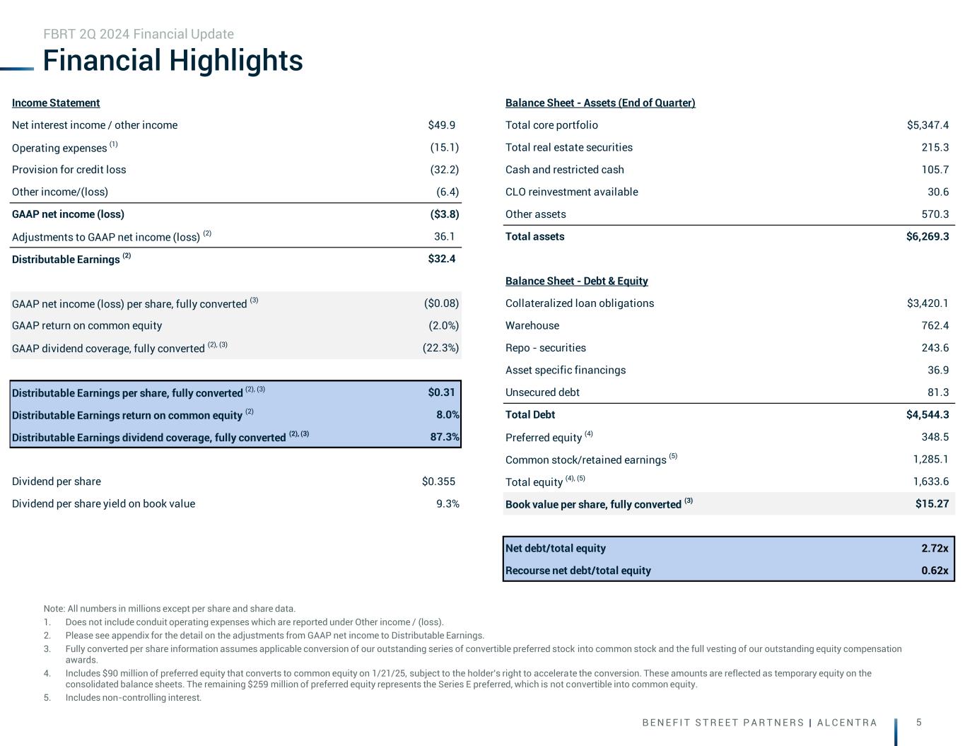 B E N E F I T S T R E E T P A R T N E R S | A L C E N T R A 4 Highlights 1. Fully converted per share information assumes applicable conversion of our outstanding series of convertible preferred stock into common stock and the full vesting of our outstanding equity compensation awards. 2. Please see appendix for GAAP net income to Distributable Earnings calculation. 3. Adjusted for accumulated depreciation and amortization of real property of $11.5 million and $10.4 million at 6/30/24 and 3/31/24, respectively. 4. Cash excludes restricted cash. Total liquidity amount includes the cash available we can invest at a market advance rate utilizing our available capacity on financing lines. FBRT 2Q 2024 Financial Update Earnings • GAAP Net Income (Loss) of ($3.8) million and ($0.11) per diluted common share and ($0.08) per fully converted share (1) • Distributable Earnings (2) of $32.4 million and $0.31 per fully converted share (1) • Declared a cash dividend of $0.355 per share, representing an annualized yield of 9.3% on book value per share, fully converted (1). GAAP and Distributable Earnings (2) dividend coverage of (22%) and 87%, respectively • Book value per share, fully converted is $15.27 vs. $15.68 last quarter (1). Undepreciated book value per share, fully converted is $15.40 vs. $15.79 last quarter (1) (3) • Net debt to equity is 2.7x; recourse net debt to equity is 0.6x • 80% of financing sources are non-mark-to-market on our core book • $0.7 billion of liquidity of which $95 million is cash and $31 million is CLO reinvest available (4) • Core Portfolio: Principal balance increased by $195 million in the quarter. Closed $622 million of new loan commitments and funded $615 million of principal balance including future funding on existing loans. Received loan repayments of $240 million • Core Portfolio: Originated $1.2 billion of new loan commitments year-to-date and funded $1.0 billion of principal balance on new loans • Core Portfolio of 153 CRE loans and $5.4 billion of principal balance, average size of $36 million and 74% multifamily. During the quarter, three assets were removed from the watch list. Seven assets remain on the watch list, two of which are risk rated a five and five of which are risk rated a four Capitalization Investments Portfolio