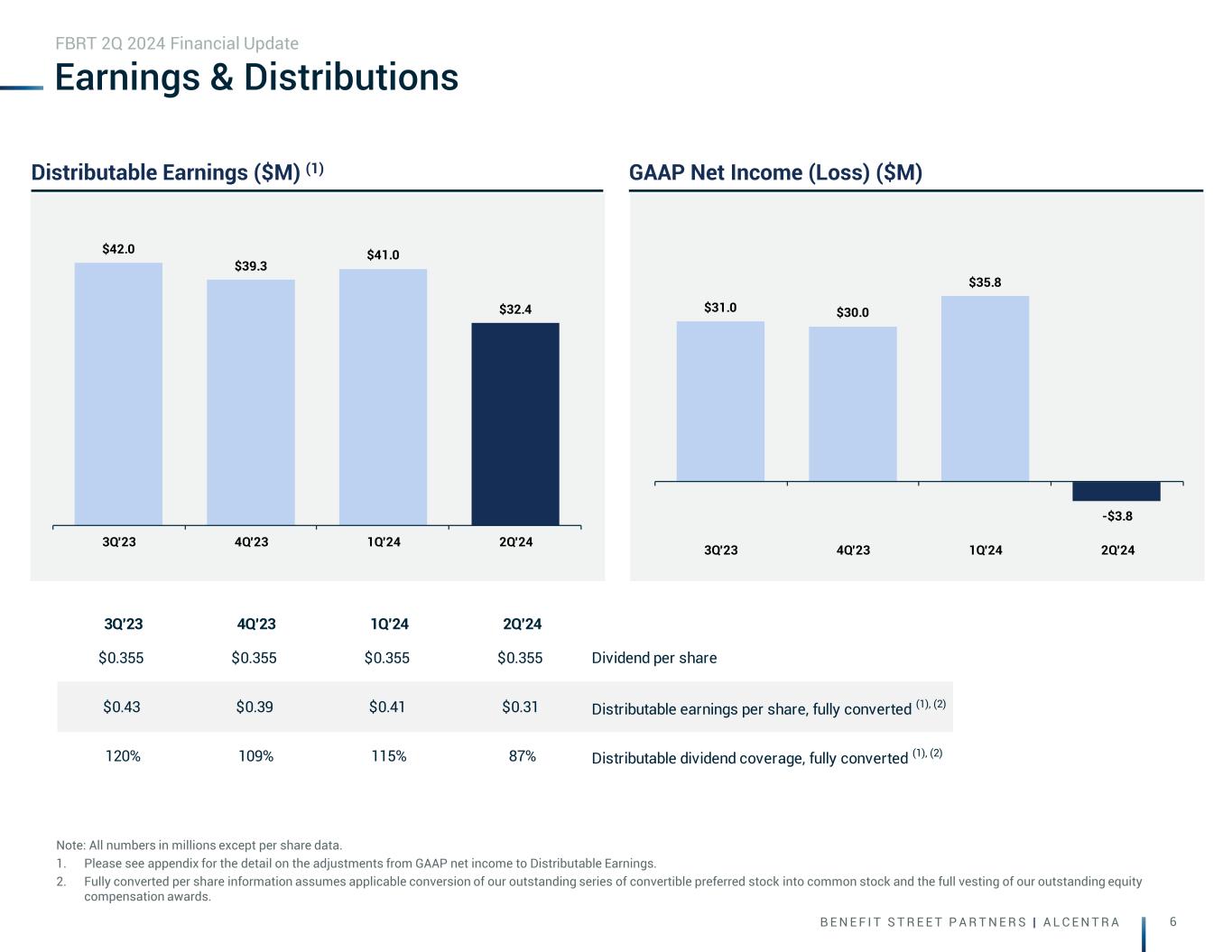 B E N E F I T S T R E E T P A R T N E R S | A L C E N T R A 5 Income Statement Balance Sheet - Assets (End of Quarter) Net interest income / other income $49.9 Total core portfolio $5,347.4 Operating expenses (1) (15.1) Total real estate securities 215.3 Provision for credit loss (32.2) Cash and restricted cash 105.7 Other income/(loss) (6.4) CLO reinvestment available 30.6 GAAP net income (loss) ($3.8) Other assets 570.3 Adjustments to GAAP net income (loss) (2) 36.1 Total assets $6,269.3 Distributable Earnings (2) $32.4 Balance Sheet - Debt & Equity GAAP net income (loss) per share, fully converted (3) ($0.08) Collateralized loan obligations $3,420.1 GAAP return on common equity (2.0%) Warehouse 762.4 GAAP dividend coverage, fully converted (2), (3) (22.3%) Repo - securities 243.6 Asset specific financings 36.9 Distributable Earnings per share, fully converted (2), (3) $0.31 Unsecured debt 81.3 Distributable Earnings return on common equity (2) 8.0% Total Debt $4,544.3 Distributable Earnings dividend coverage, fully converted (2), (3) 87.3% Preferred equity (4) 348.5 Common stock/retained earnings (5) 1,285.1 Dividend per share $0.355 Total equity (4), (5) 1,633.6 Dividend per share yield on book value 9.3% Book value per share, fully converted (3) $15.27 Net debt/total equity 2.72x Recourse net debt/total equity 0.62x Financial Highlights Note: All numbers in millions except per share and share data. 1. Does not include conduit operating expenses which are reported under Other income / (loss). 2. Please see appendix for the detail on the adjustments from GAAP net income to Distributable Earnings. 3. Fully converted per share information assumes applicable conversion of our outstanding series of convertible preferred stock into common stock and the full vesting of our outstanding equity compensation awards. 4. Includes $90 million of preferred equity that converts to common equity on 1/21/25, subject to the holder's right to accelerate the conversion. These amounts are reflected as temporary equity on the consolidated balance sheets. The remaining $259 million of preferred equity represents the Series E preferred, which is not convertible into common equity. 5. Includes non-controlling interest. FBRT 2Q 2024 Financial Update