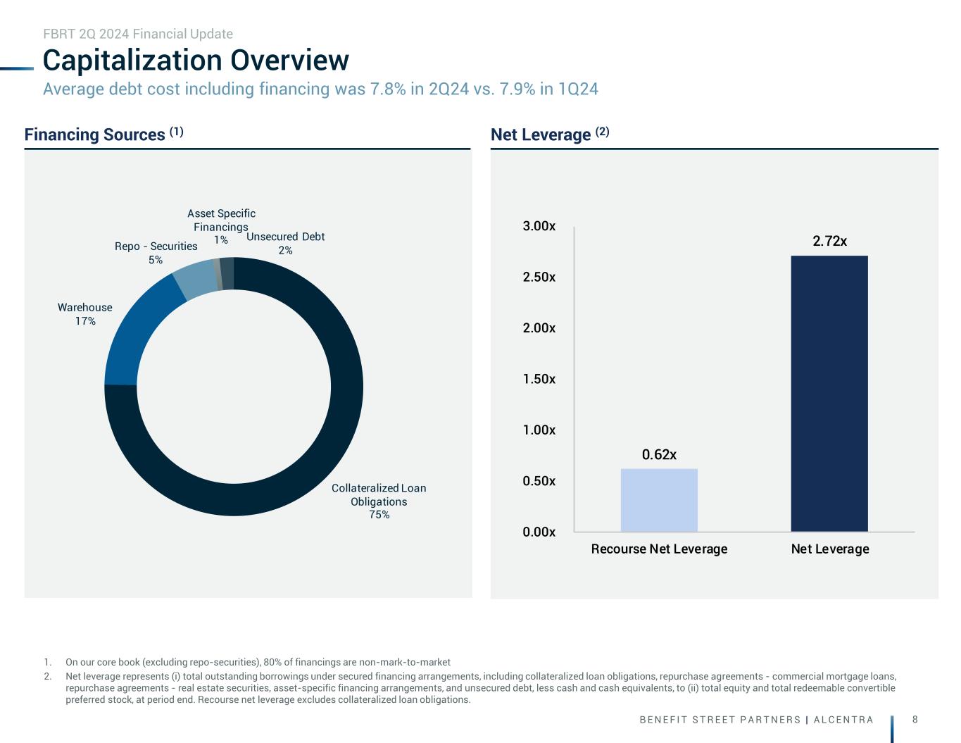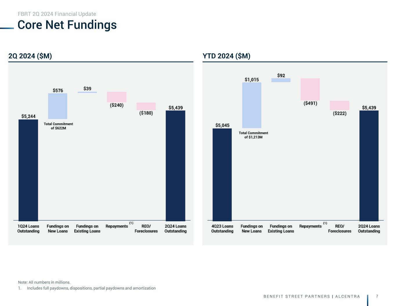 B E N E F I T S T R E E T P A R T N E R S | A L C E N T R A 7 (1 )(1 ) (1 ) Note: All numbers in millions. 1. Includes full paydowns, dispositions, partial paydowns and amortization Core Net Fundings FBRT 2Q 2024 Financial Update 2Q 2024 ($M) YTD 2024 ($M) Total Commitment of $622M Total Commitment of $1,213M