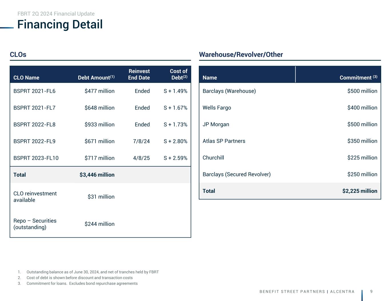 B E N E F I T S T R E E T P A R T N E R S | A L C E N T R A 8 Capitalization Overview 1. On our core book (excluding repo-securities), 80% of financings are non-mark-to-market 2. Net leverage represents (i) total outstanding borrowings under secured financing arrangements, including collateralized loan obligations, repurchase agreements - commercial mortgage loans, repurchase agreements - real estate securities, asset-specific financing arrangements, and unsecured debt, less cash and cash equivalents, to (ii) total equity and total redeemable convertible preferred stock, at period end. Recourse net leverage excludes collateralized loan obligations. FBRT 2Q 2024 Financial Update Financing Sources (1) Net Leverage (2) Average debt cost including financing was 7.8% in 2Q24 vs. 7.9% in 1Q24 Collateralized Loan Obligations 75% Warehouse 17% Repo - Securities 5% Asset Specific Financings 1% Unsecured Debt 2% 0.62x 2.72x 0.00x 0.50x 1.00x 1.50x 2.00x 2.50x 3.00x Recourse Net Leverage Net Leverage