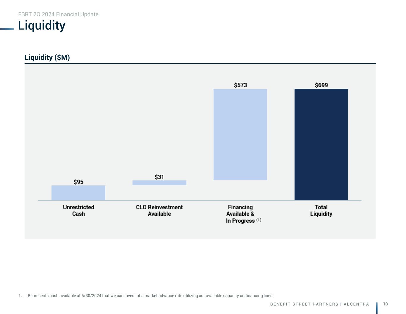 B E N E F I T S T R E E T P A R T N E R S | A L C E N T R A 9 Financing Detail 1. Outstanding balance as of June 30, 2024, and net of tranches held by FBRT 2. Cost of debt is shown before discount and transaction costs 3. Commitment for loans. Excludes bond repurchase agreements FBRT 2Q 2024 Financial Update CLOs Warehouse/Revolver/Other CLO Name Debt Amount(1) Reinvest End Date Cost of Debt(2) BSPRT 2021-FL6 $477 million Ended S + 1.49% BSPRT 2021-FL7 $648 million Ended S + 1.67% BSPRT 2022-FL8 $933 million Ended S + 1.73% BSPRT 2022-FL9 $671 million 7/8/24 S + 2.80% BSPRT 2023-FL10 $717 million 4/8/25 S + 2.59% Total $3,446 million CLO reinvestment available $31 million Repo – Securities (outstanding) $244 million Name Commitment (3) Barclays (Warehouse) $500 million Wells Fargo $400 million JP Morgan $500 million Atlas SP Partners $350 million Churchill $225 million Barclays (Secured Revolver) $250 million Total $2,225 million